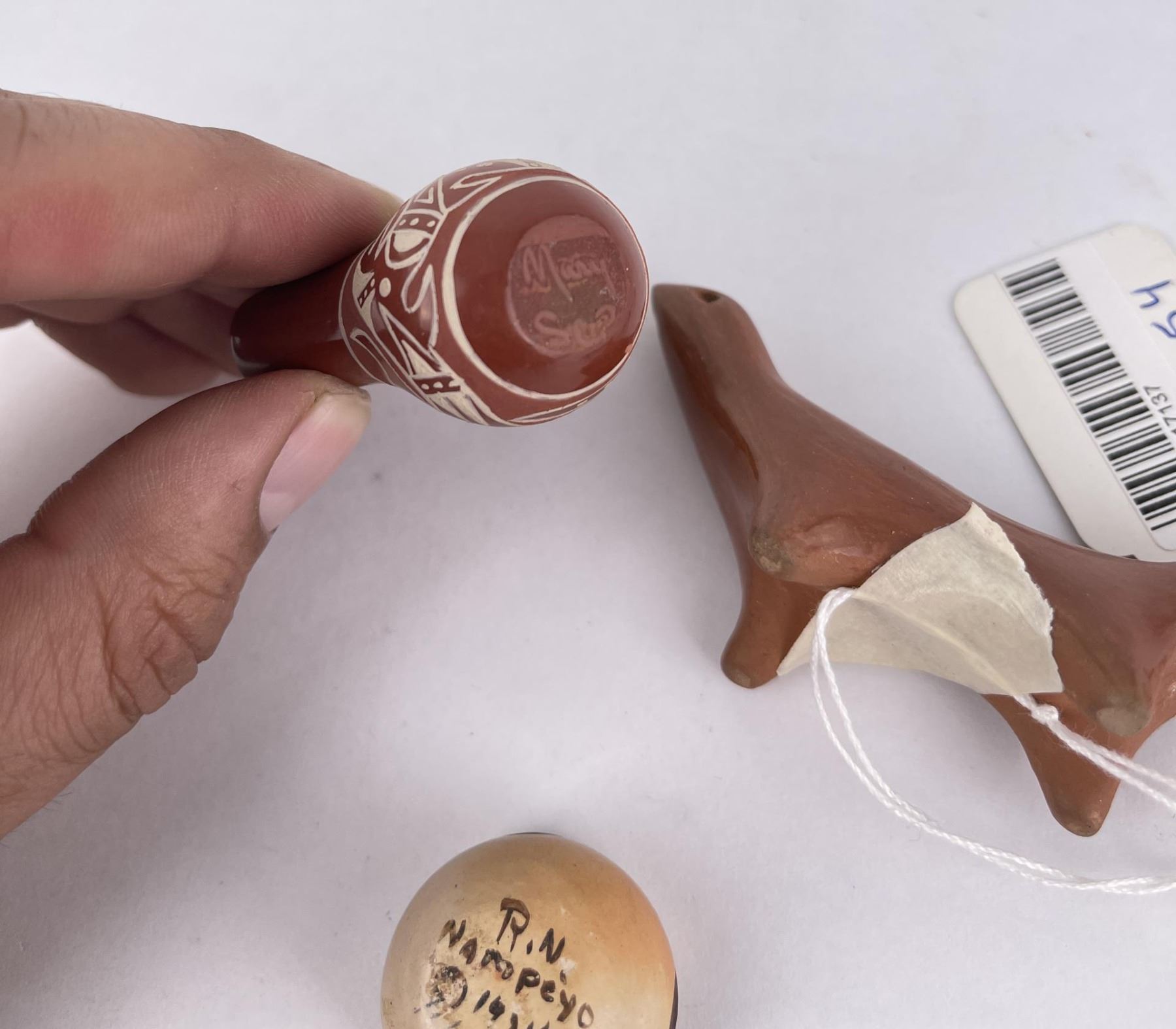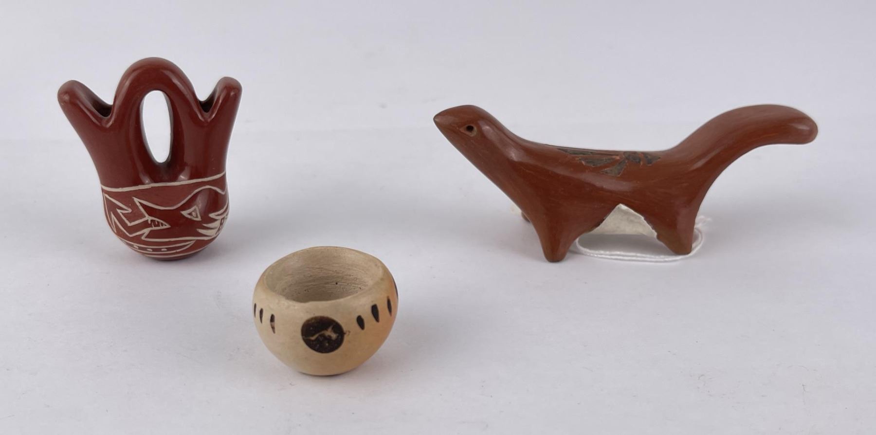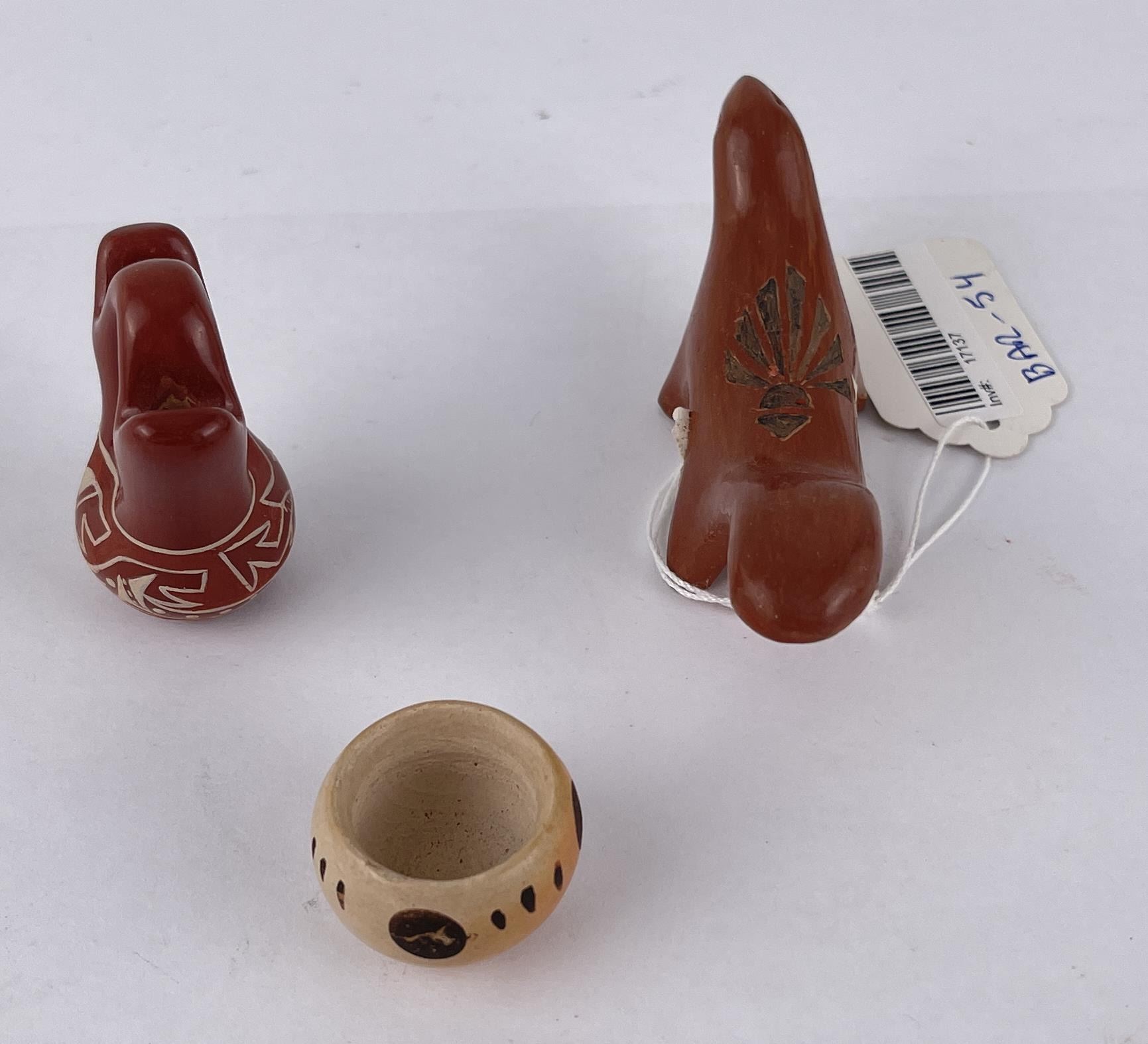 Small pot is by Rachel Nampeyo, Wedding vase is by Mary of Santa Clara Pueblo, San Ildefonso Pueblo squirrel is by Alfred Aguilar. Allard Auction Collection Inv: BAR 17137