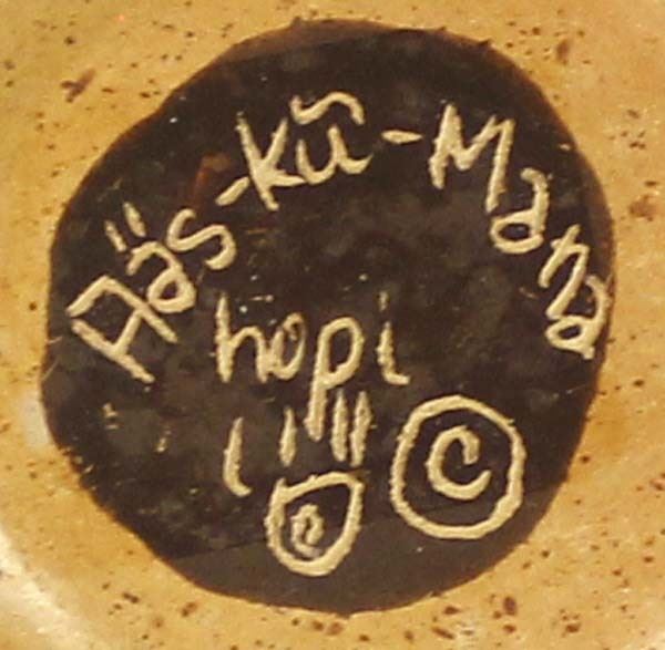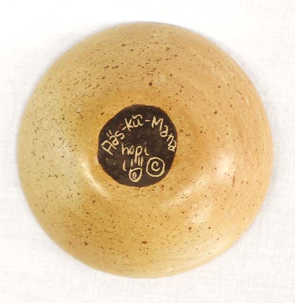 Miniature Native American Hopi Pottery Shallow Bowl by Aas-ku-Mana (Gwen Setalla), measures 1'' x 2.5'' and is signed on the bottom, FYI: ''Gwen Setalla (Mustard Juice Girl) Setalla was born into the Hopi Reservation in 1964. She is a member of the Bear Clan and the Water Clan.''