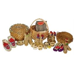 Miniature Indian baskets & moccasins/boots; 11 baskets, includes early 1900's NW Coast 2 handled bas