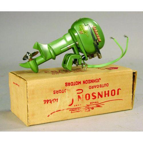 Miniature Johnson Sea-Horse Outboard Motor, 25 horse power. Motor and box in mint condition, except box is missing one flap. 5 1/2 inches tall.