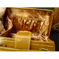 Miniature leather suitcases. Set of 2. Leather with rayon lining covered with travel stickers. Perfect as doll or teddy bear accessories. Large case is 5.25" x 7.5" x 3". Small case is 4" x 6" x 2". Condition: