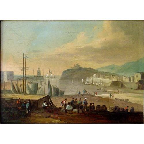 Extraordinary miniature seascape painting an old port. Comes in a custom-made heavy bronze frame with a dark red velvet matting. One of a pair of miniatures with matching frames listed separately. In good used condition with crackle as shown. Please ask questions, request additional photos and shipping costs before buying.