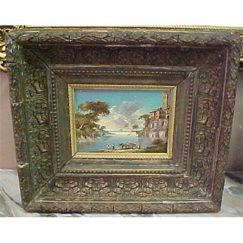 Wonderful miniature painting of a landscape scene. Painted in the 1940's and signed by Italian artist "Miguel Montaner". Although Montaner painted large canvases, he was most famous for his miniatures.