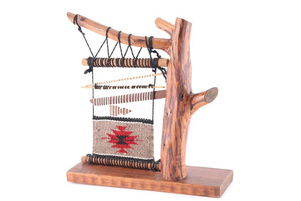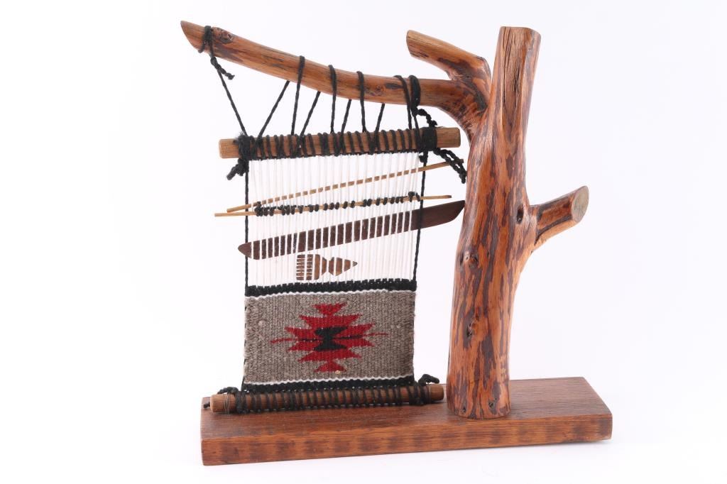 With partially completed rug in gray, black, red. Measures 14 1/2" x 13".