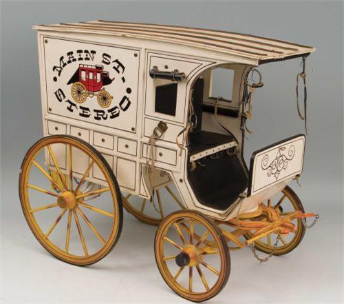 Miniature Main St Stereo One Horse Drawn Wagon. 20" tall. 24" long. Fine detail. Complete. Excellent condition. (est $2,500-4,500)