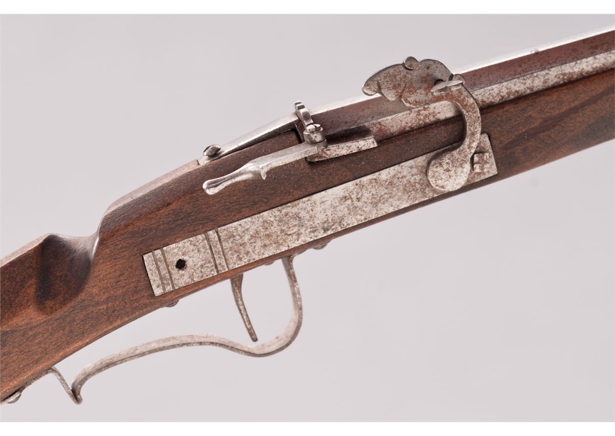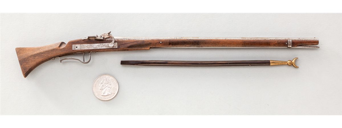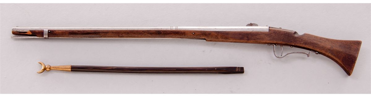 Miniature Matchlock Musket with shooting stick, 11'' overall, full-length walnut stock, finished in the white, with brass-tipped ebony shooting stick. Condition is fine with just beginning patina to metal surfaces. Small chip to left side near muzzle. Est.: $300-$500.
