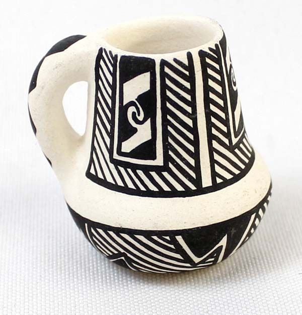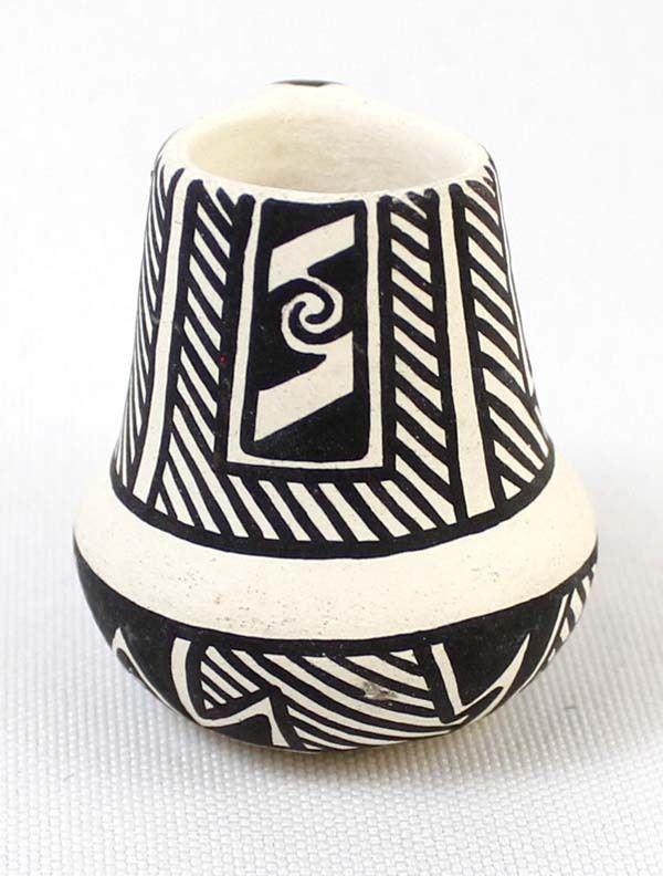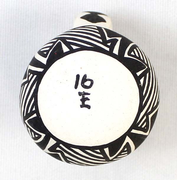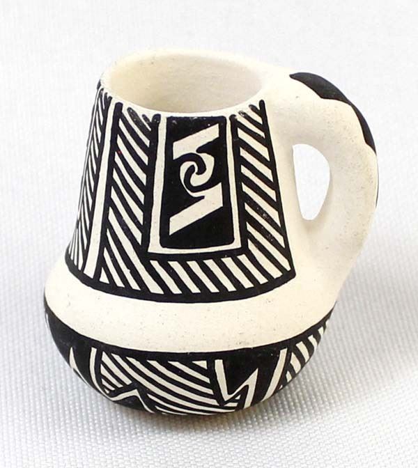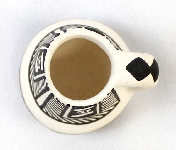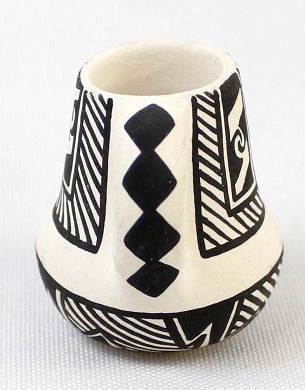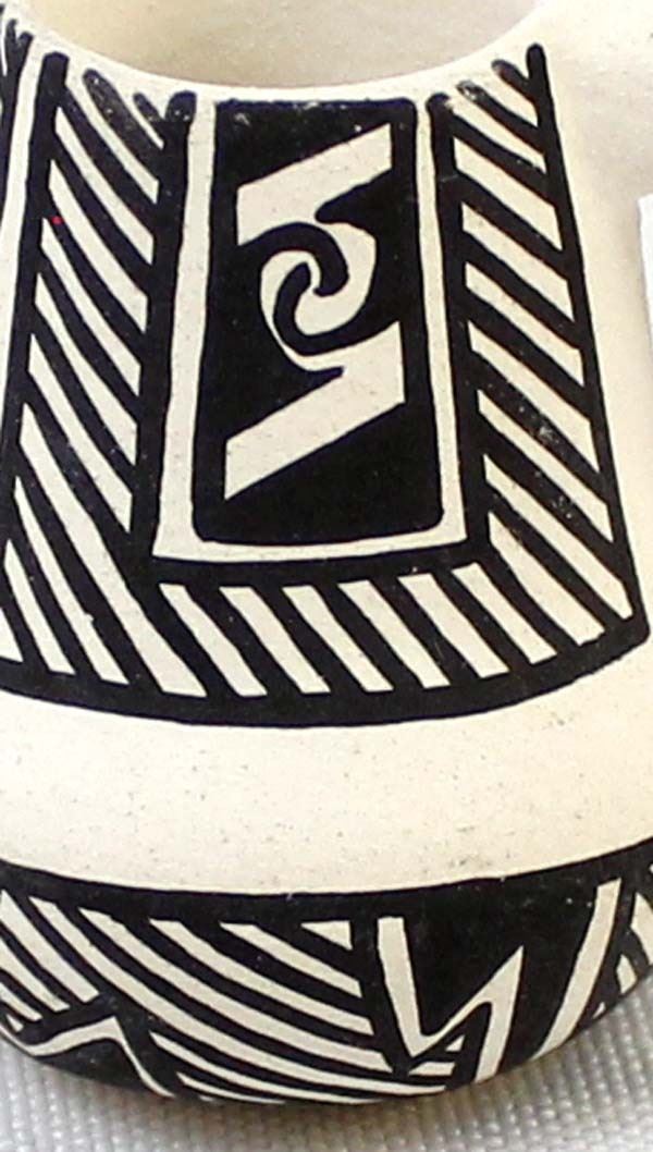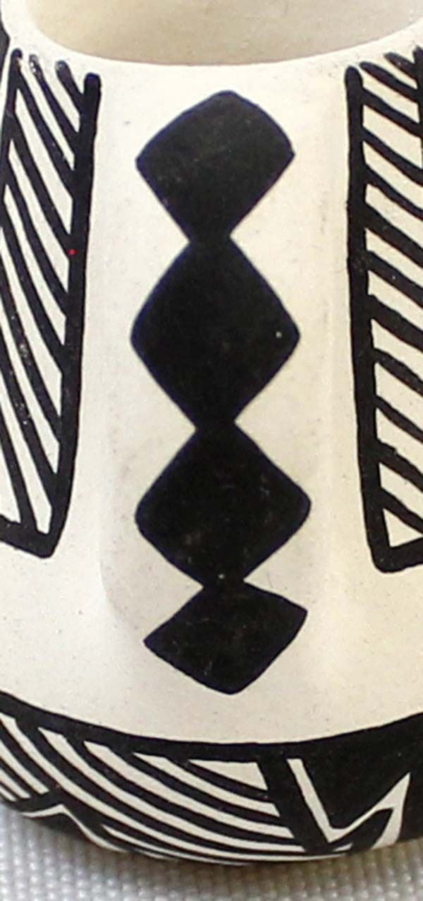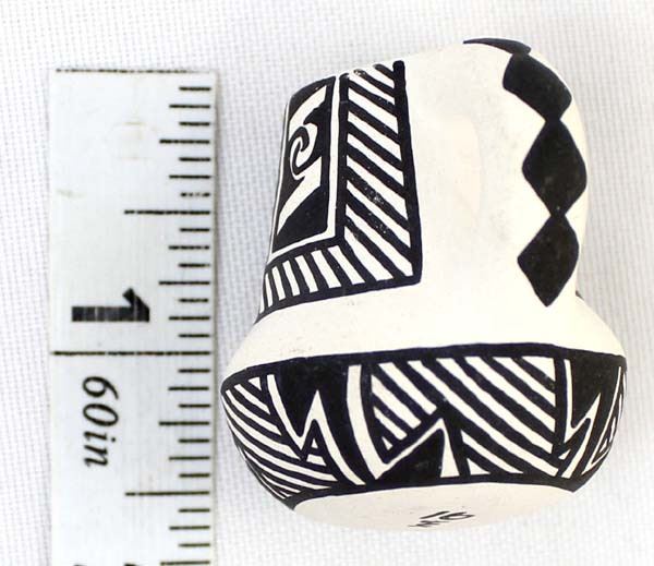 Miniature Mimbres Designed Pottery Jar, measures 1.25'' x 1.5'' and has artist's initials on the bottom