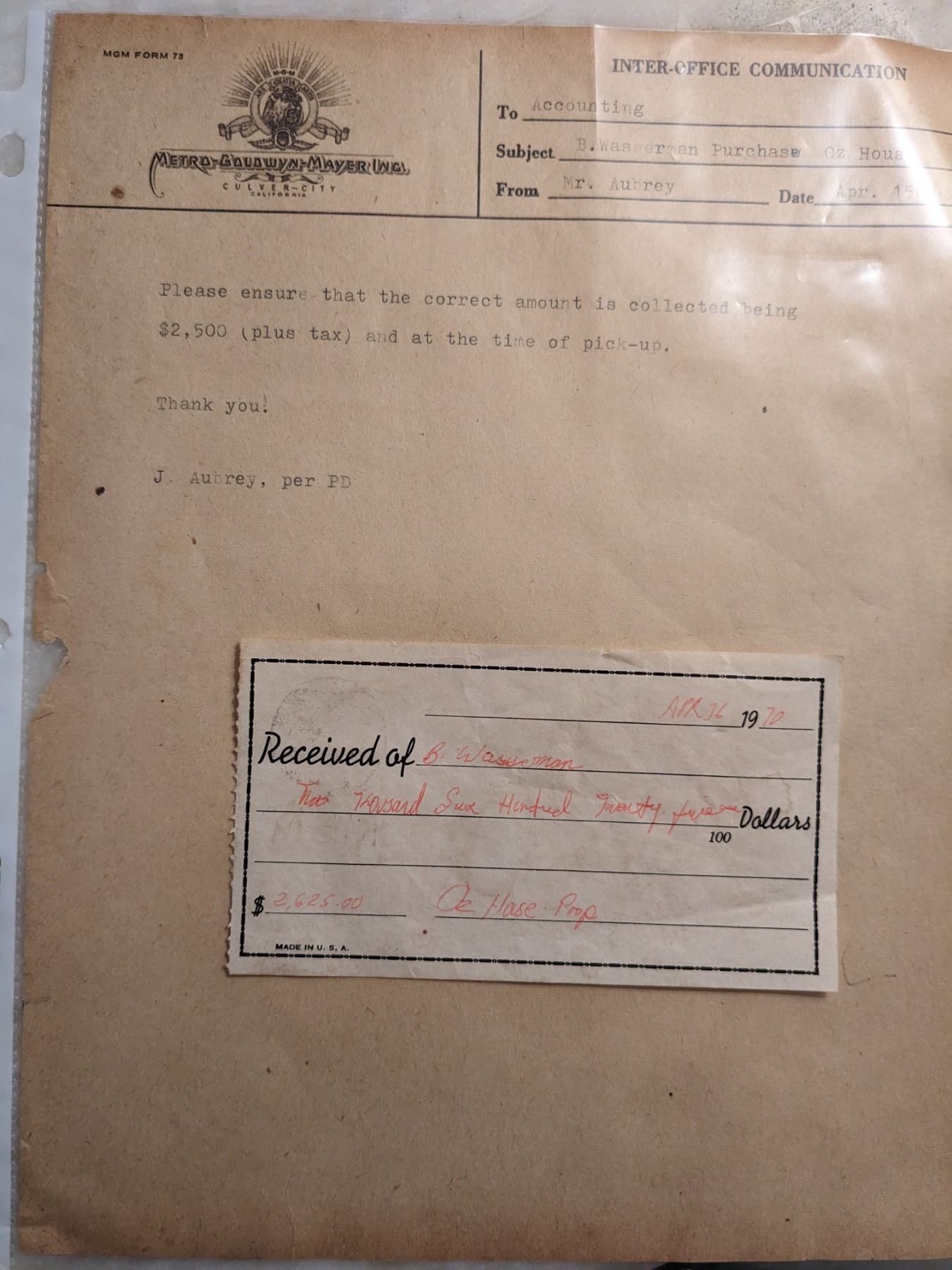 This model miniature was created in 1938 by MGM studios and used in the filming of one of the most iconic moments in cinematic history: the twister scene from the “Wizard of Oz”. Props from this iconic film are some of the most coveted items of Hollywood memorabilia and are very rare. This model has never been to auction before. It was sold in 1970 to a private collector by the former head of MGM. The model has impeccable provenance. The prop was authenticated in 1973 by the person in charge of special effects for the 1939 film, Arnold Gillespie (also known as the “Wizard of MGM”). Mr. Gillespie was a legend in the field of special effects. He swore an Affidavit confirming the authenticity of the model. According to Mr. Gillespie, this model was one of three used in the filming of the twister sequence and was the only to survive production. His Affidavit has been authenticated by his grandson, Robert Welch. Mr. Welch edited Mr. Gillespie’s book on special effects and is himself an expert on the Wizard of Oz. It is extraordinarily detailed, which along with its design and construction is consistent with industry standards and practices at the time. The house is constructed of different types of hardwood and each roof shingle was meticulously cut in accordance with how these types of models were made almost 100 years ago. The small holes on the top of the miniature where wire was inserted to control the prop while falling and spinning are present. The miniature was formed with horse hide glue which was the type used during the period for construction of models. Inside the miniature is an MGM property tag. The model is constructed on a scale of ½ inch to a foot. 13.5"x14.5"x12.5” Please see the full length video on our web site regarding the provenance of the miniature. In addition to the original Affidavit of Arnold Gillespie, the miniature comes with a letter of authenticity from noted film historian Marc Wanamaker. Also included is the original MGM receipt and inter-office memorandum regarding the sale in 1970 to the private collector. The model also comes with a custom made acrylic case and stand which simulates the position of the house during the iconic filming scene. Comes with a Certificate of Authenticity from Studio Auctions.