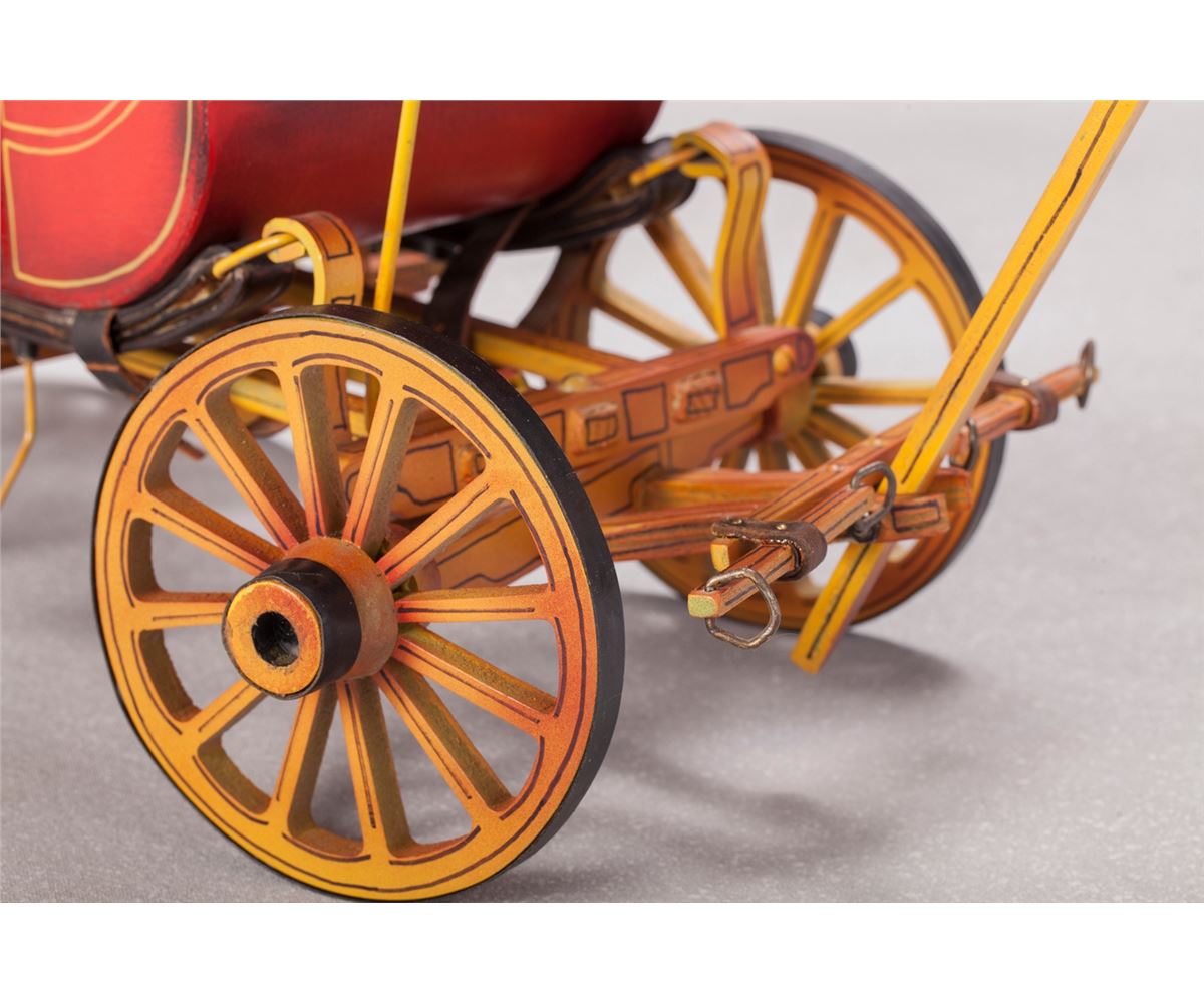 Miniature Model Stagecoach. This is an unsigned coach, but attached when purchased, was the card of Dale Ford, Scottsdale, AZ. The piece could be an early example of Dale's work but lacks some of the detailing associated with the master of the miniature coach. It is a nice coach, 21" in length (body) 15" tall to the top of luggage and 11" wide. It is pin-striped and lettered "Butterfield Overland Stage" along the roof line and "U. S. Mail" on the door. Complete with rolled leather curtains, leather boot and suspension.