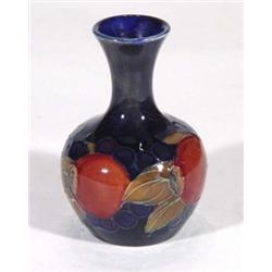 Miniature Moorcroft baluster vase, hand painted and tubelined with 'Pomegranate' pattern onto a dark