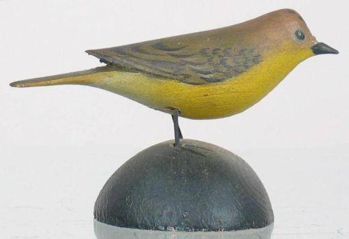 Miniature Nashville warbler by A. E. Crowell, East Harwich, MA in XOC with minor imperfections. Rectangular impressed brand and "Nashville Warbler" written in ink on the bottom of the base.