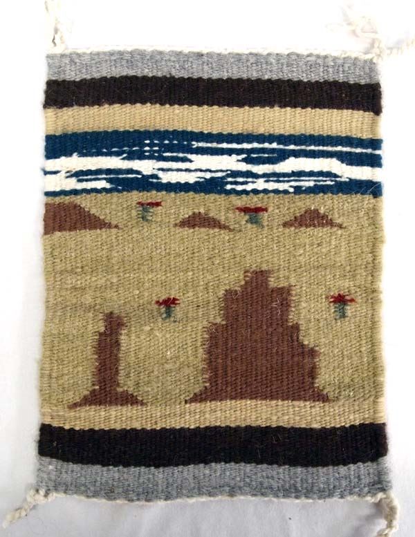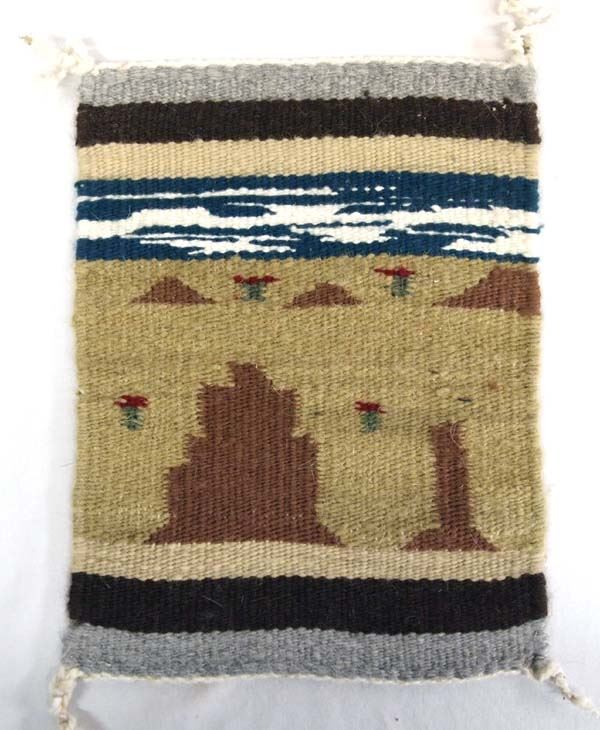 Miniature Native American Navajo Monument Valley Pictorial Textile Rug, 4 cornered tassels intact, measures 12.25''L x 9''W