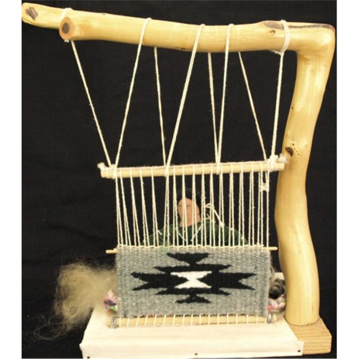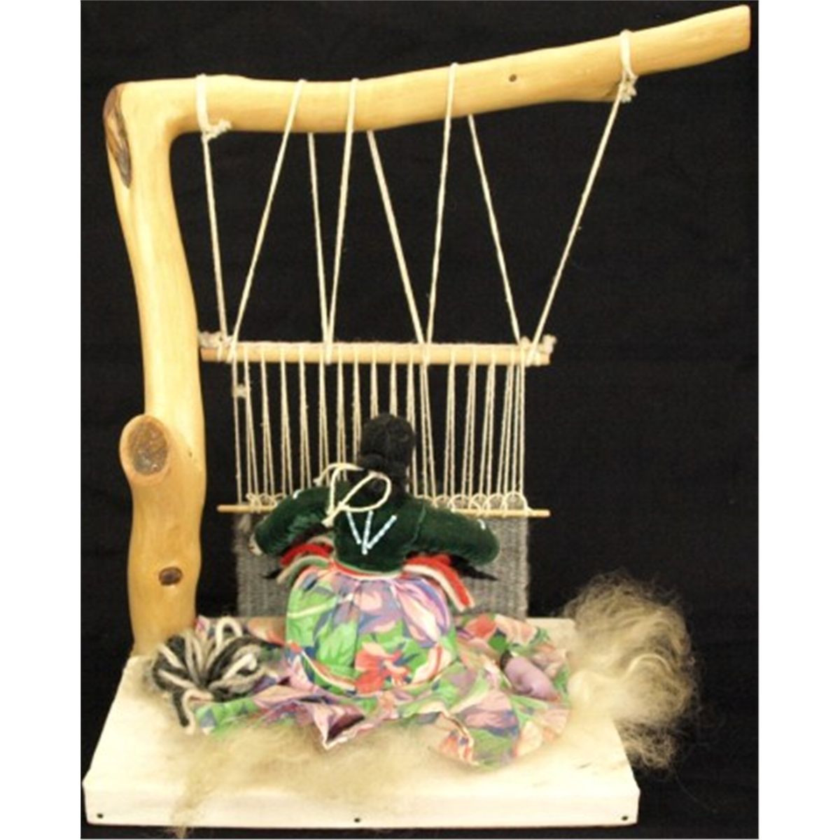 Miniature Navajo rug loom with weaver and partial rug, 13" tall.