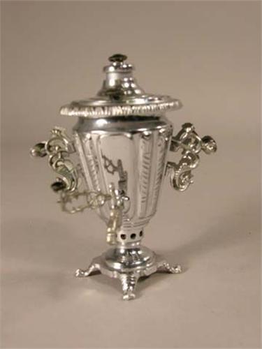Miniature nickel silver coffee urn - highly decorated. 5" tall. Ex. cond.