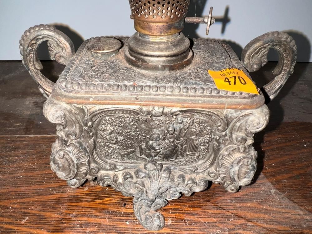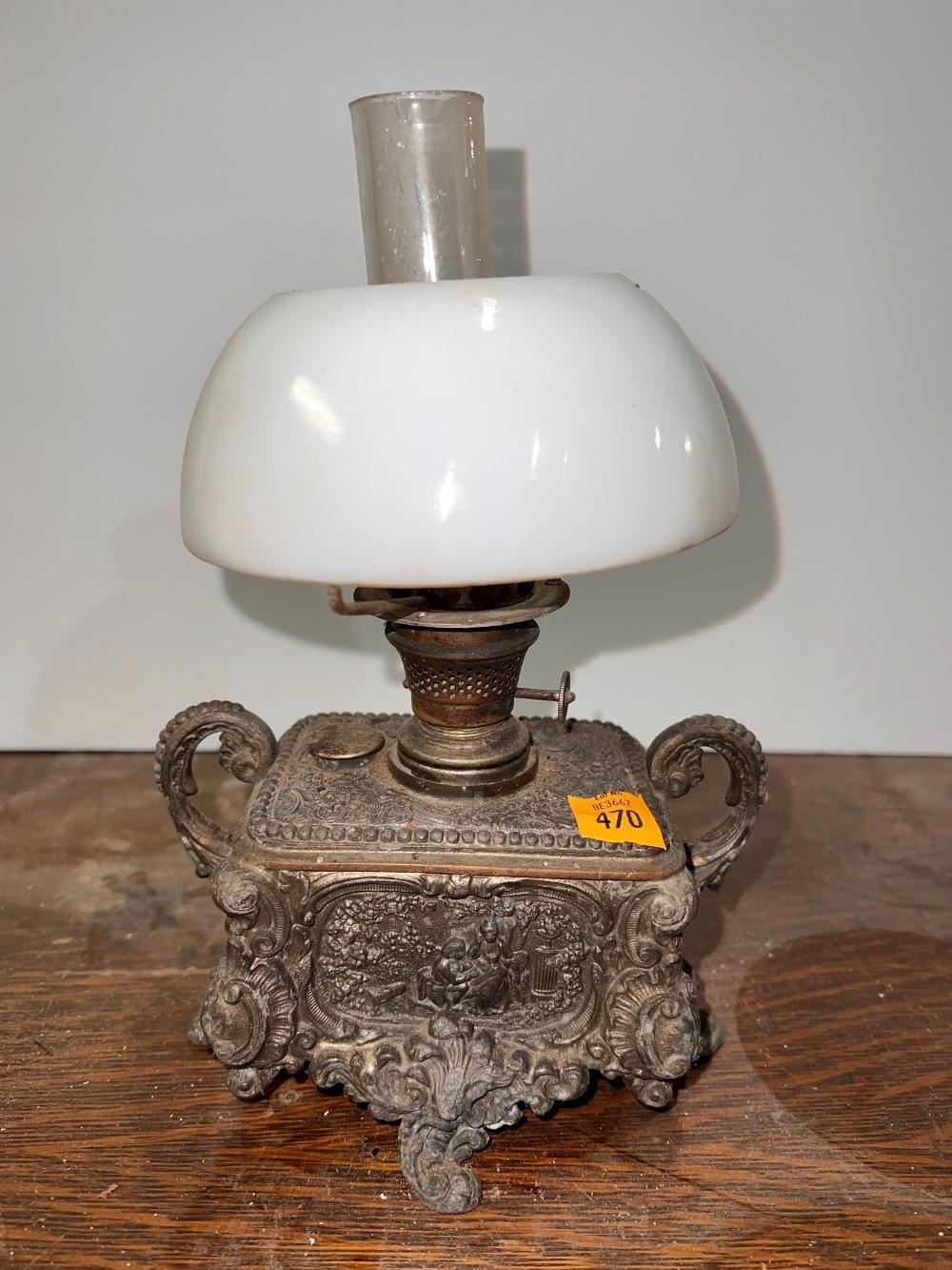 Miniature oil lamp with victorian ladies and men design. All original, from the lifetime collection, measures approx. 10 inches tall x 7 inches wide.