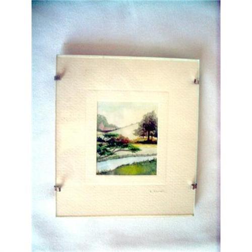 Depicts the English countryside, hills, trees and the roof of a farmhouse way in the distance, peeking out behind a hillside. Magnificent vibrant colors, amazingly detailed in such a small painting. The painting measures just over 1-3/4" wide from east to west and is 2-1/4" inches in height. It is matted on an off-white matting. It is unframed and has four clips holding the glass around the picture, as shown in the photograph. Framed measurements are 4-1/4" wide by 5" inches tall. It is ready to hang as such or could be re-matted and reframed using a much larger matt and more traditional frame for a more intense and dramatic effect, as so many miniatures are now. Condition is excellent, estimated age around the 1980's.