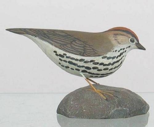 Miniature Oven Bird by Jess Blackstone. "Oven Bird", #6 and typical JB signature along with collection #15 in a circle and $4.00 in pencil on the bottom of the mount. XOC. (decoy)