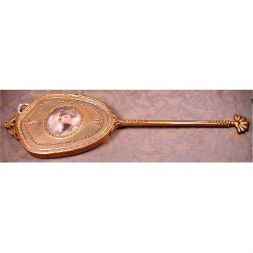 Beautiful French style bronze ormolu hand mirror with an extra long handle. On the back is a HAND-PAINTED miniature of Marie Antoinette.