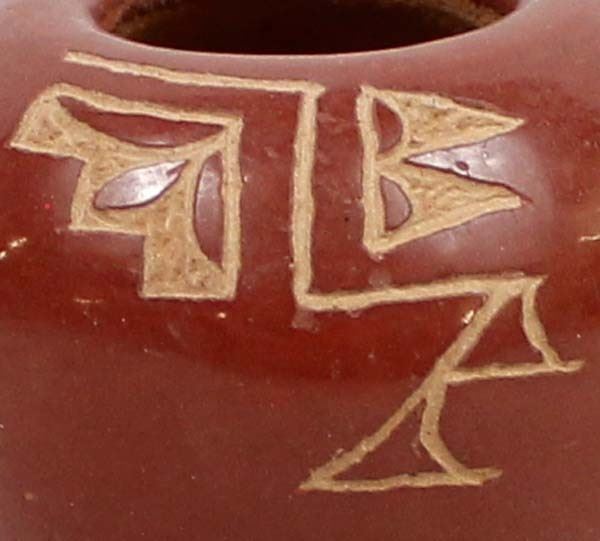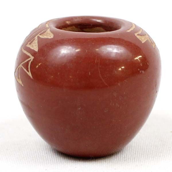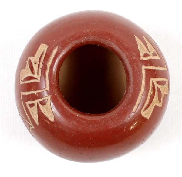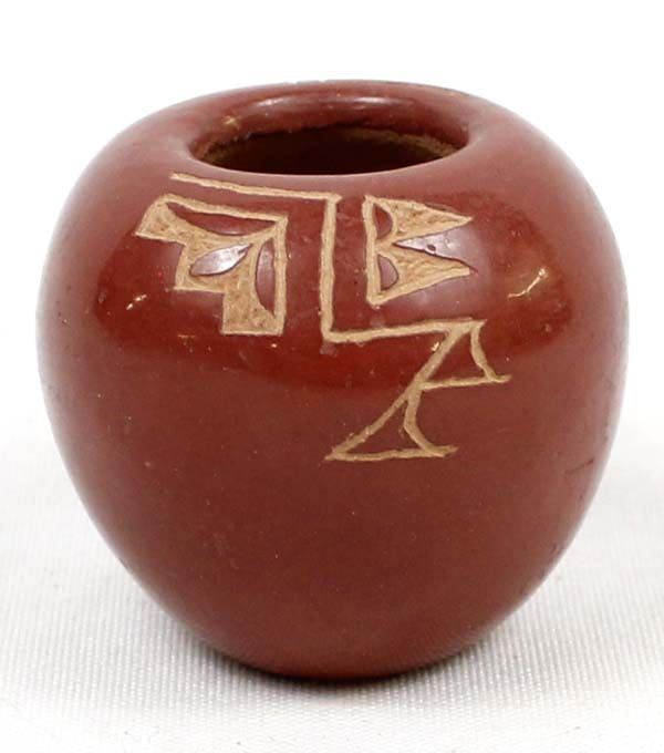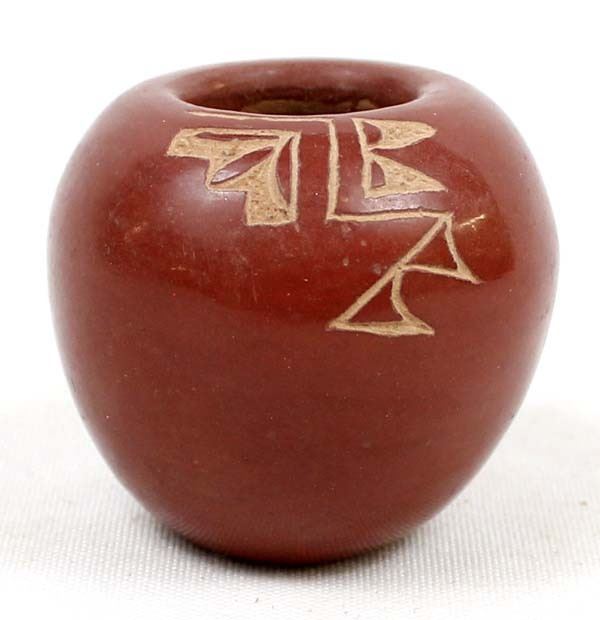Miniature Vintage Native American Pojoaque Pottery Bowl, carved lines and designs, measures 1.5'' x 2'', possible artist Mary Tachey Gutierrez