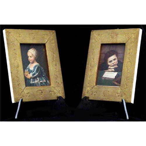 Charming pair of miniature portrait prints after famous paintings of children: "Baby Stuart," and "Letter to Mother." "Baby Stuart" is a reproduction of Sir Anthony Van Dyck's painting by the same name. It portrays the son of King Charles I of England. "Lettera a la Mamma," is a reproduction of De Tivoli's painting by the same name showing a pensive young boy writing a letter to his mother. Both come in beautiful, matching gilt frames protected by convex glass and have ring on the reverse to hang from the wall. Easels not included. In good used condition as shown. Please ask questions, request additional photos and shipping costs before bidding.