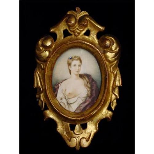 </font></strong>Beautiful miniature portrait of lady dressed in white with an exposed breast. It is marked on the back as shown (appears to say M. Sabattinni followed by a signature. Comes in a Florentine-style gilt wood frame and is protected by an oval glass. In good used condition with minor signs of wear as shown. Please ask questions, request additional photos and shipping costs before buying.