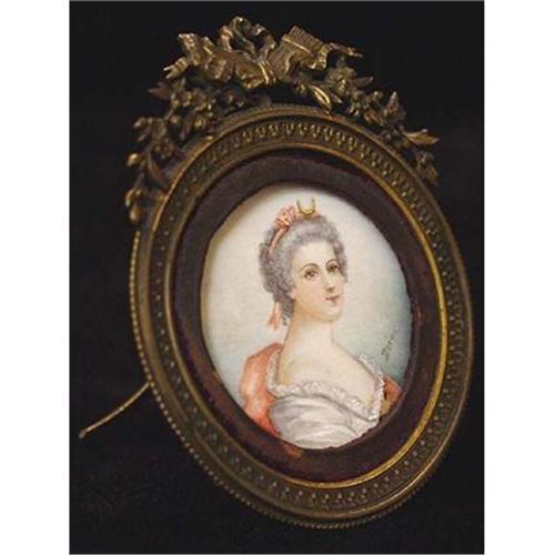 Very old miniature portrait of Mme. Bourbon-Conty signed on the right Drea. It is undated but appears to be painted on vellum, a material used to paint miniatures prior to the introduction of ivory (as a base to paint watercolor miniatures) in the 18th Century. According to the inscription on the reverse (see photo) the sitter is a lady from the Bourbon-Conty family, possibly Louise de Bourbon-Conty (1726-1759), Duchesse d'Orleans, a member of the French Royal family. The bronze frame is numbered and has an easel stand as well as a top ring that allows the miniature to be either placed on a table or hung on a wall. In very good used condition with wear to the frame's silk backing as shown. Please ask questions, request additional photos and shipping costs before buying.