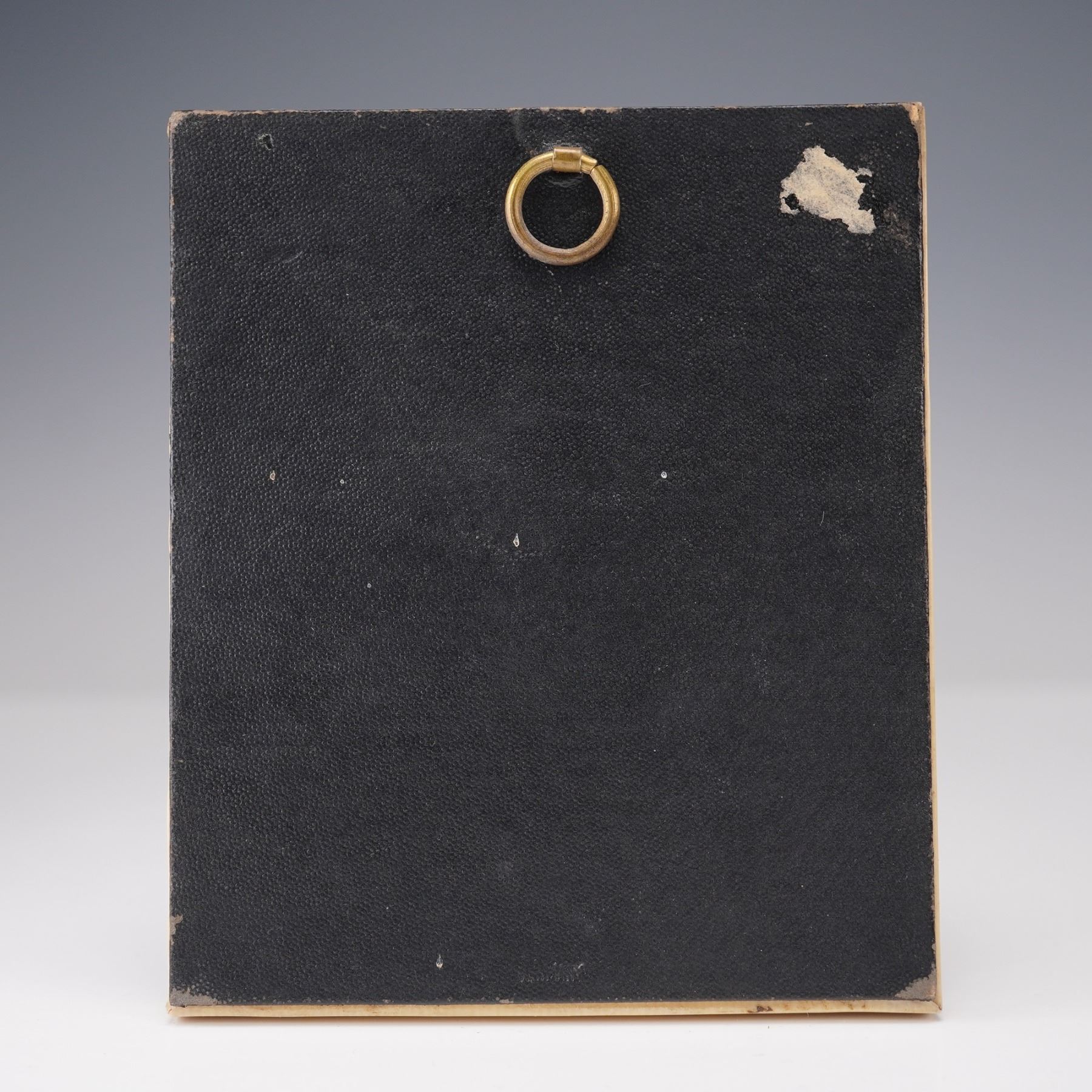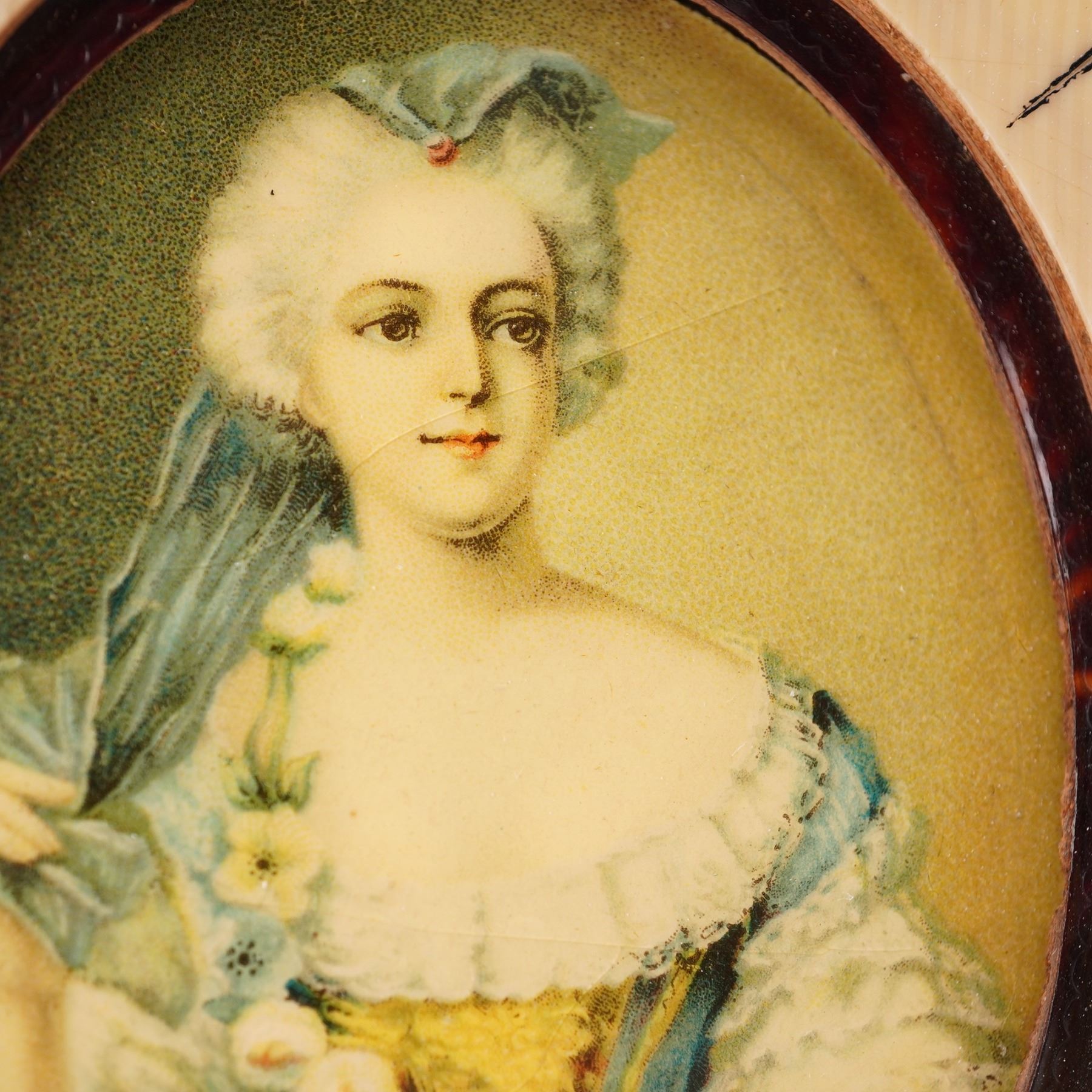 Finely detailed oval miniature portrait depicting a lady in 18th century attire holding a blue fan, her dress adorned with delicate floral accents and lace detailing, set within an inlaid frame and geometric black linework, the image rendered with soft pastel tones and subtle shading to enhance depth and realism. Measures 4"L x 4.75"H.