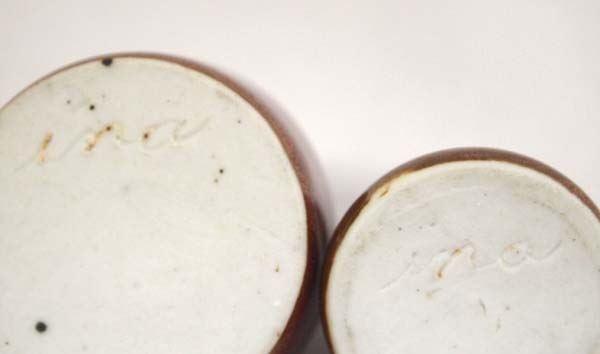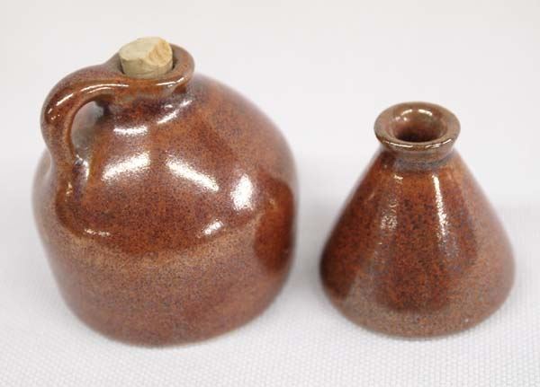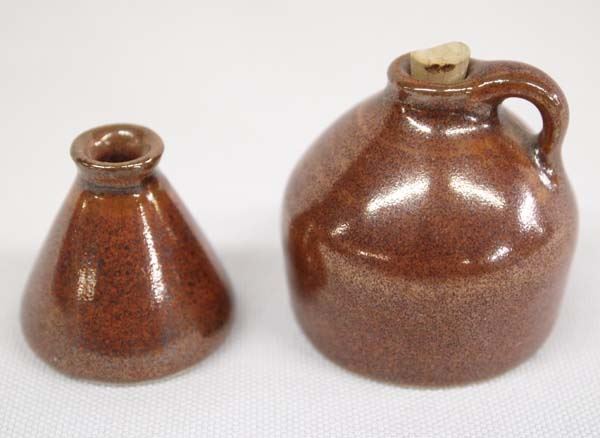 Miniature Glazed Stoneware Jug and Ink Well by Ina Chapler, largest measures 1.5'' x 1''D, both are signed ina for Ina Chapler, FYI: ''Ina Chapler is a collector of tribal and ancient artifacts. She currently designs necklaces and earrings that give these timeless treasures new life. Ina Chapler's clay jars and jugs closely resemble the vessels that once lined the storage shelves of farmhouses. The shapes and colors are very similar, but there is one major difference. The pots of this Englewood Cliffs ceramist are tiny -- less than three inches tall.''
