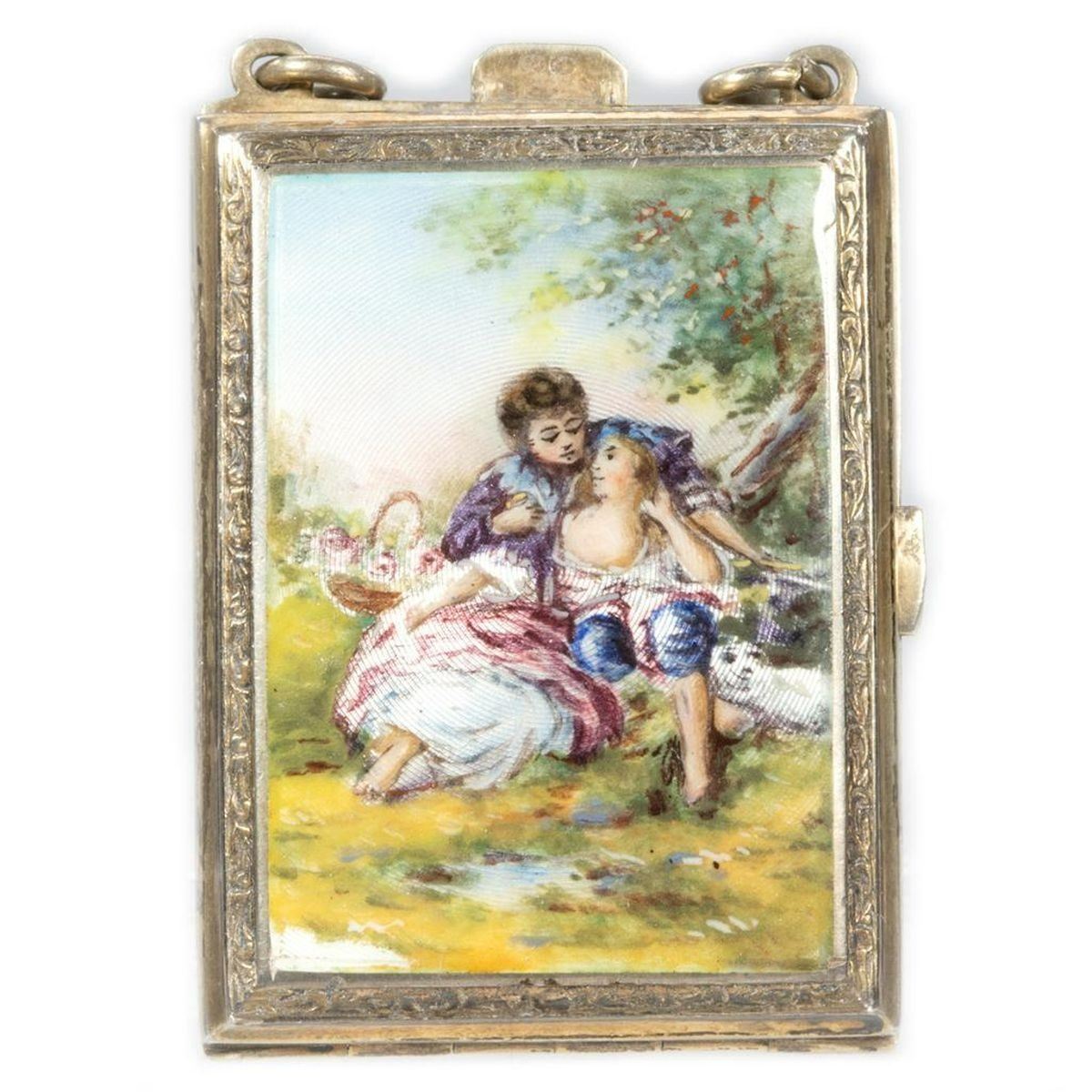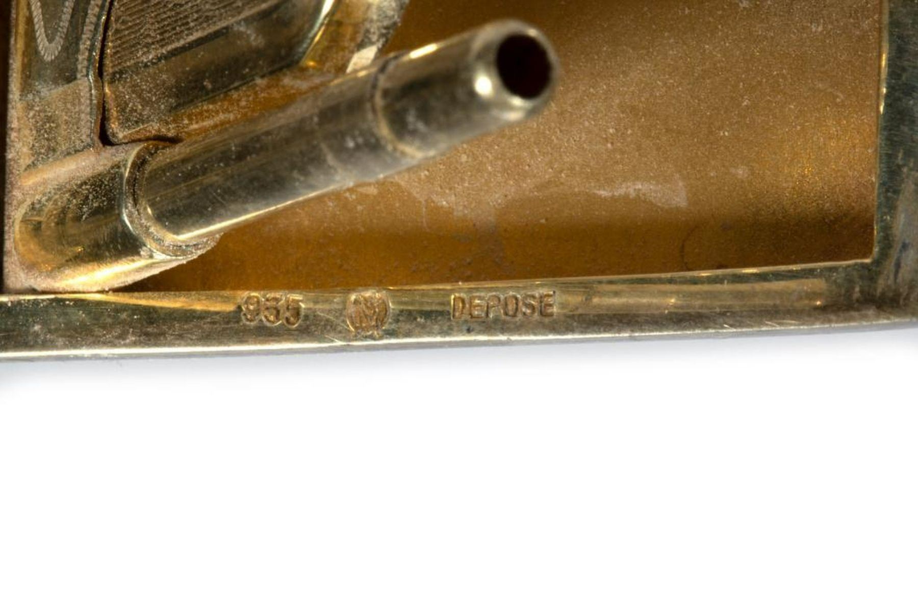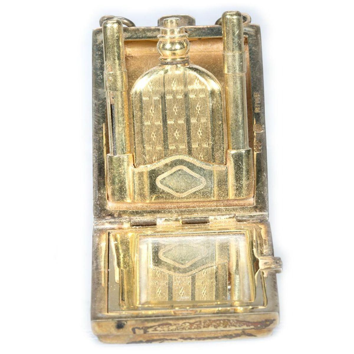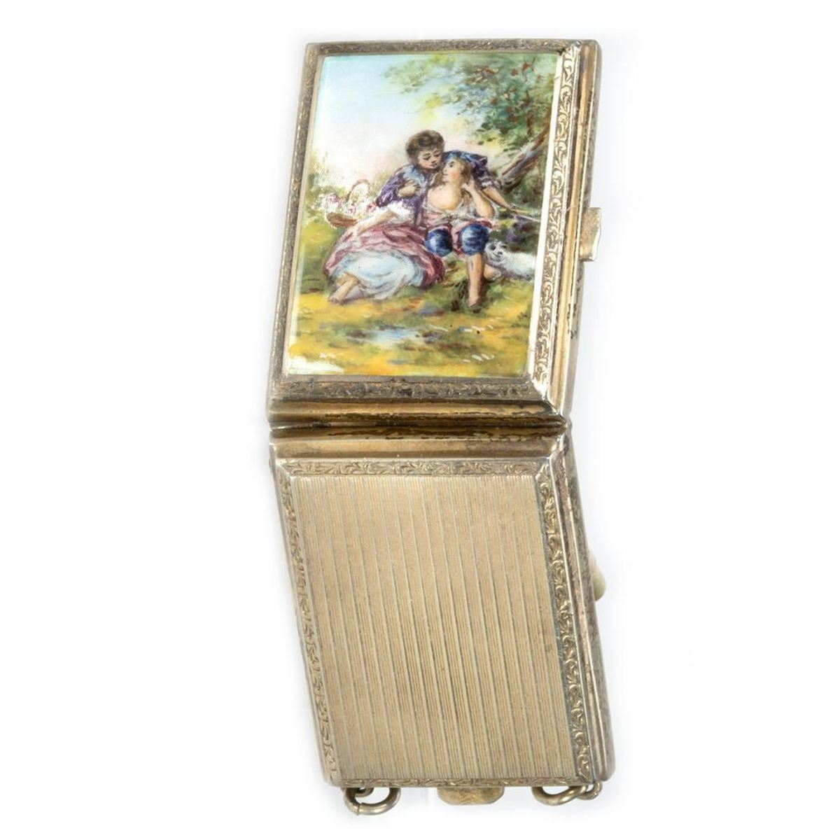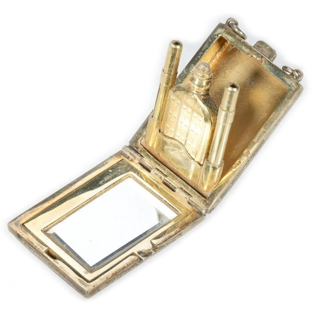 Opens to reveal a fitted perfume flask with screw top, and a mirrored powder compartment. Marks: "935 M(?) DEPOSE." 1 1/2in. x 1 2/16in. Condition: chipping at corner of lid decoration.