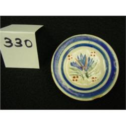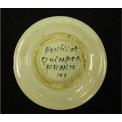 Miniature Quimper plate. Tulip pattern. Marked "Henriot Quimper France 109". 2-1/8" wide. Condition: Edge chip.