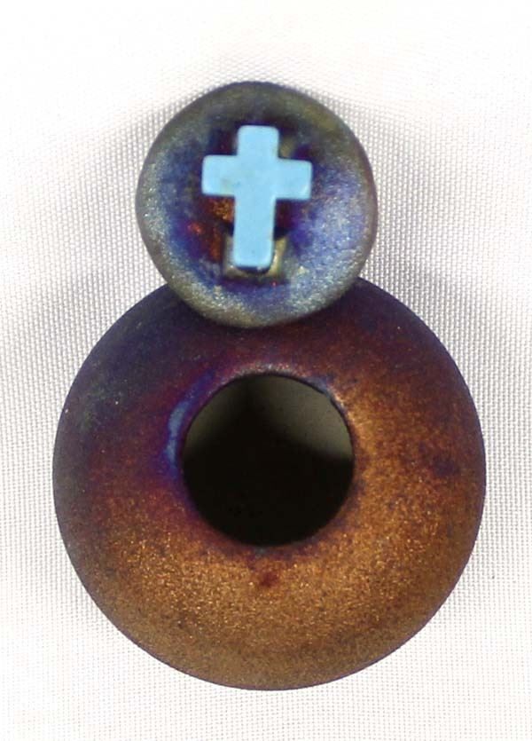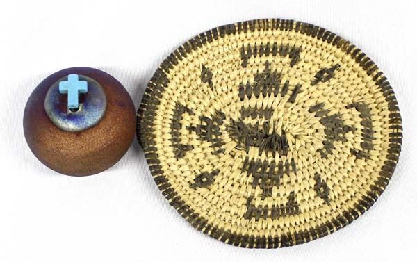 Miniature Raku Pot by Jeremy Dill, measures 2.25'' x 2'' and is signed on the bottom, embellished with a turquoise cross on lid, Native American Hopi Flat Basket or Tray for Piki Bread, measures 4.5'' x 5''