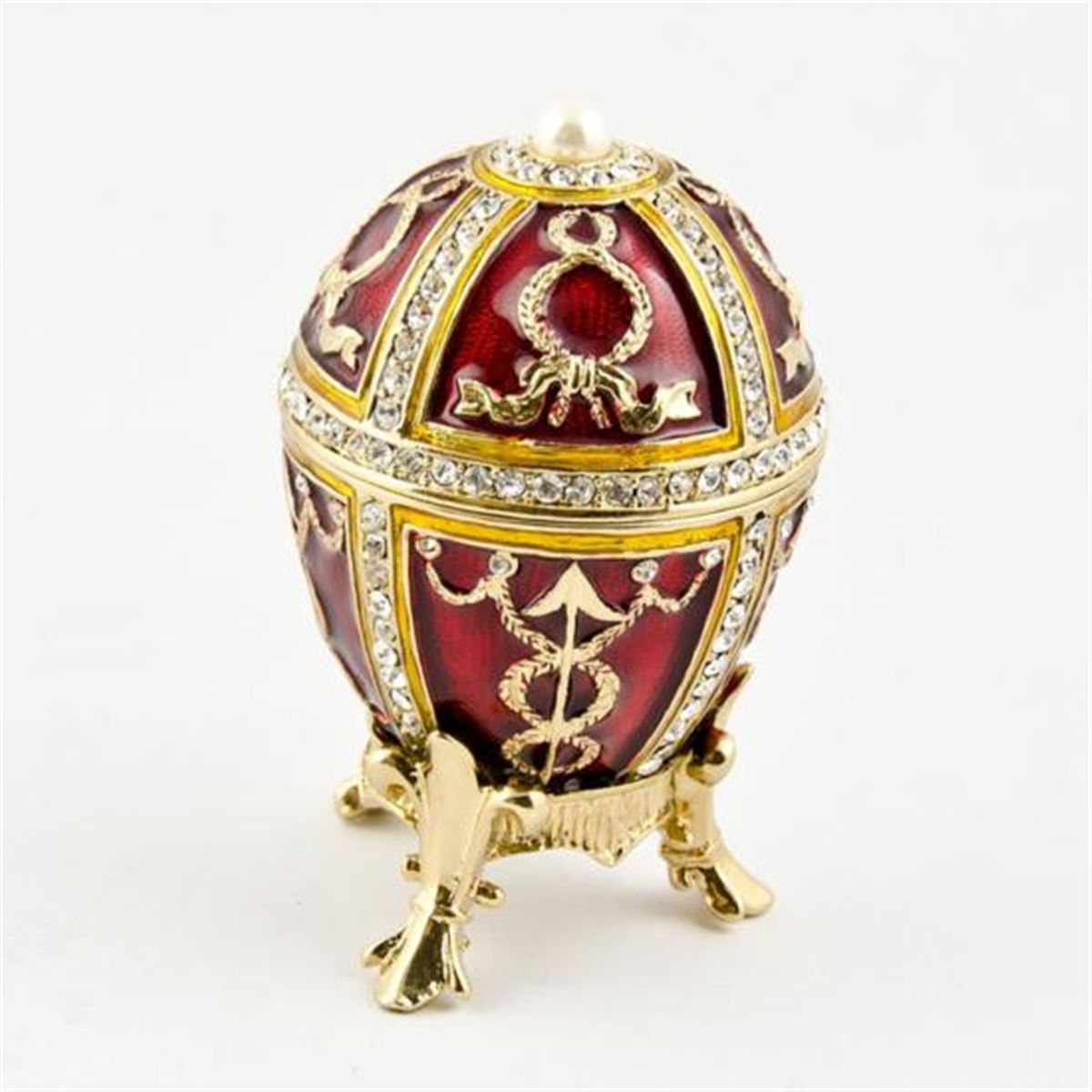 Miniature Rosebud Egg, Dimensions: 2.5in (H) X 1.5in (D), Weight: 6 oz , Material: Pewter, Crystals, Enamel. The famed Faberge eggs are jeweled eggs, often with the most ornate, minuscule designs on them. The House of Faberge made the original pieces from 1885 to 1917. At that time, they became popular gifts given during the Easter season. Larger versions were made for the Russian royal family, including Alexander III and Nicolas II. Of these, 42 of the 50 originals exist today. Most Faberge eggs, though, were much smaller and hung from a chain around the neck. These eggs have precious metals on them or gemstone decorations, often with intricate detailing. These are a symbol of luxury and thought of as individual masterpieces.