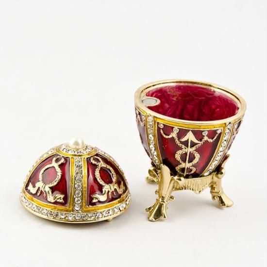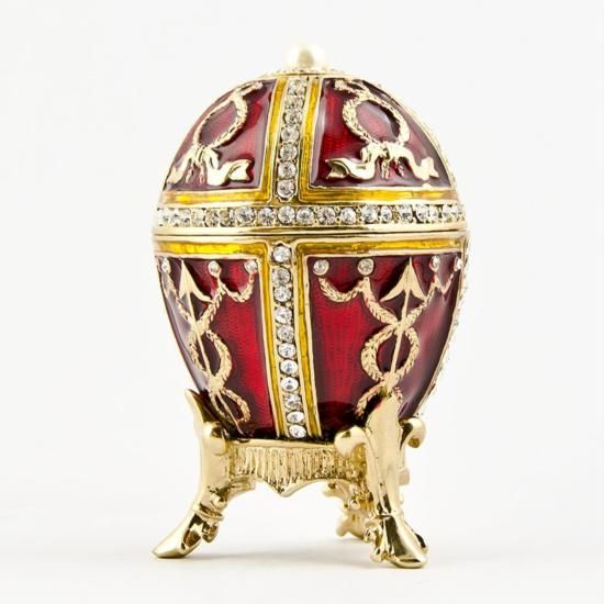 Miniature Rosebud Egg, Dimensions: 2.5in (H) X 1.5in (D), Weight: 6 oz , Material: Pewter, Crystals, Enamel. The famed Faberge eggs are jeweled eggs, often with the most ornate, minuscule designs on them. The House of Faberge made the original pieces from 1885 to 1917. At that time, they became popular gifts given during the Easter season. Larger versions were made for the Russian royal family, including Alexander III and Nicolas II. Of these, 42 of the 50 originals exist today. Most Faberge eggs, though, were much smaller and hung from a chain around the neck. These eggs have precious metals on them or gemstone decorations, often with intricate detailing. These are a symbol of luxury and thought of as individual masterpieces.