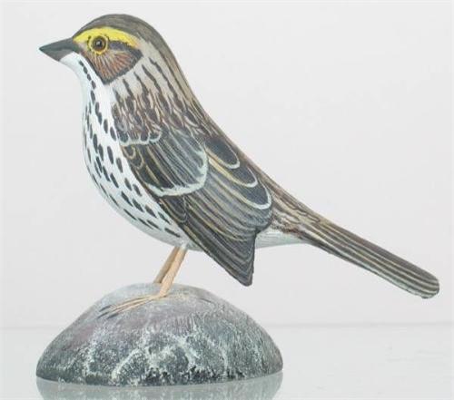 Miniature Savannah Sparrow with drop wing carving by Jess Blackstone. "Savannah Sparrow", #8 and typical JB signature along with collection #50 in a circle in pencil on the bottom of the mount. XOC. (decoy)