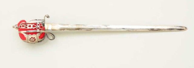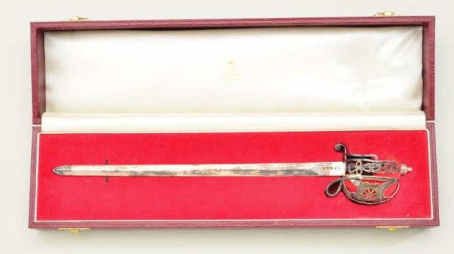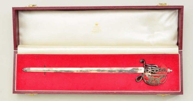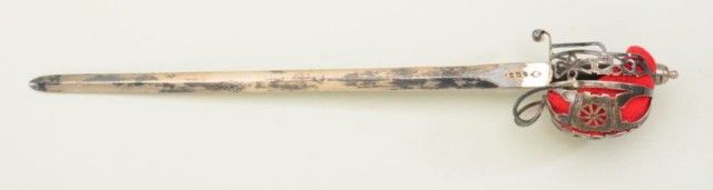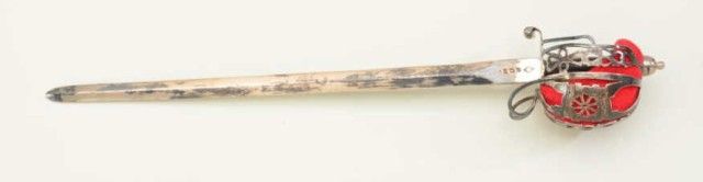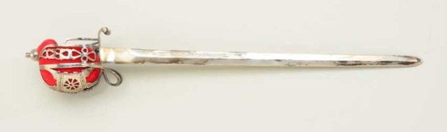 Miniature Scottish basket hilt broadsword in sterling silver by "Garrard & Co. of London" showing appointment as goldsmiths and crown jewelers in the lid of the fitted case. The finely detailed mini measures approx. 12-1/2" and is approx 1/3 scale. The workmanship is excellent and the basket is beautifully detailed. The blade is fully hallmarked and the case is impeccably made with fitted bottom in the French style lined with satinin the lid and Moroccan leather exterior with gold book-binders trim. Condition is fine to excellent. We would date it 1900-1950. A superb miniature. Jerry Traillins collection. Est.;$ 1,500-$3,000.