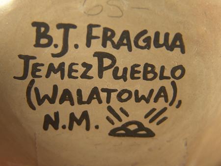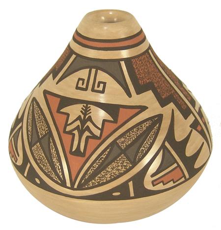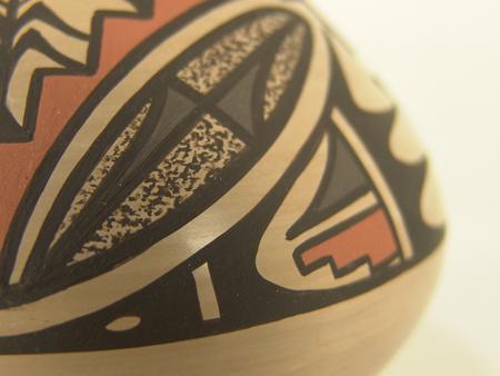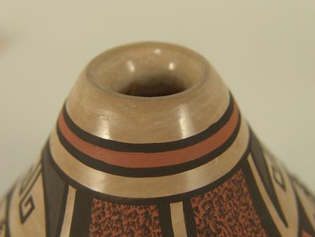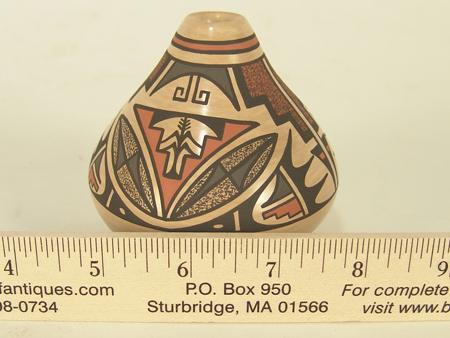 Great miniature Jemez polychrome seed jar with geometric motif. 3-1/4" x 3"