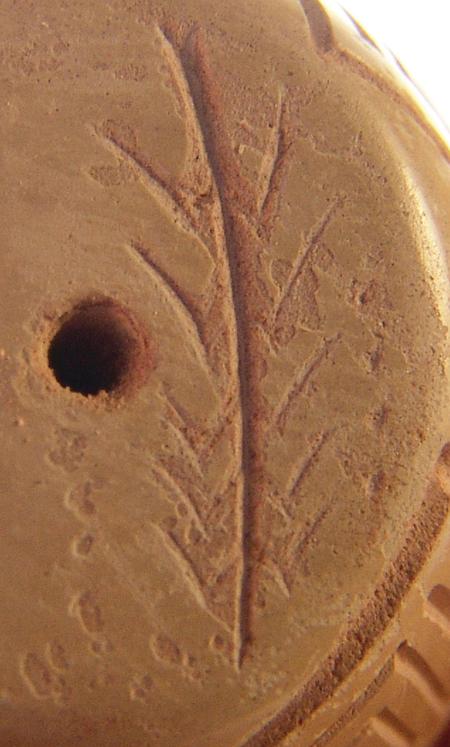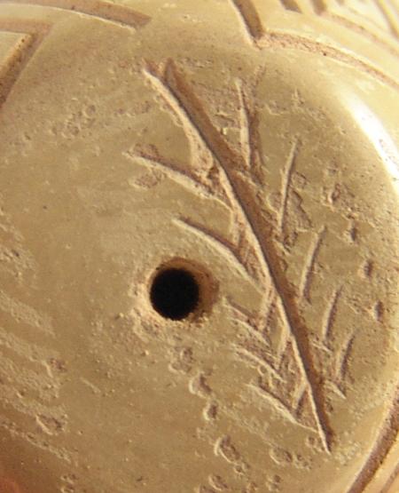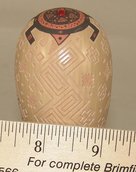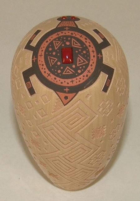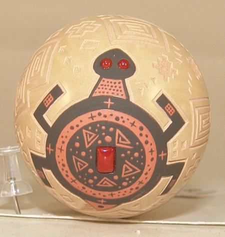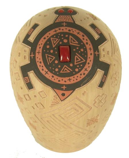 Exceptional miniature Jemez seed jar with geometric sgraffitto motif and a black and red turtle set with coral stones. 1-3/4" x 3"