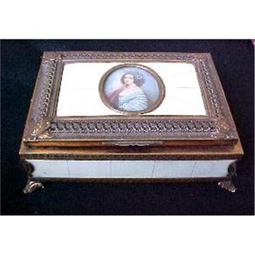 Rather beautiful celluloid jewel box set with a handpainted miniature of a lady, velvet lined interior but some childs scibble, and hole when it was a musical box, plus a chain to hold lid, snapped.