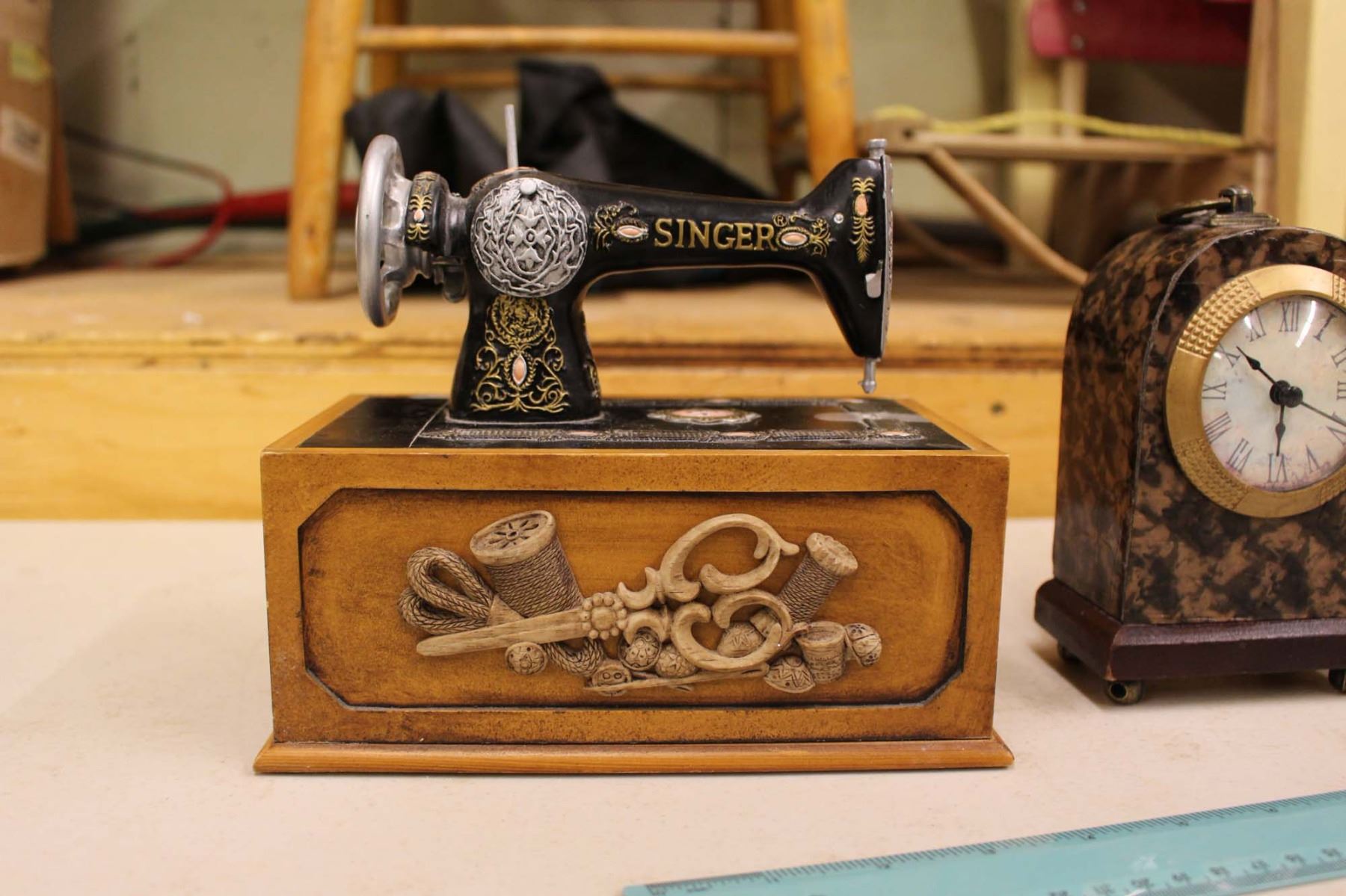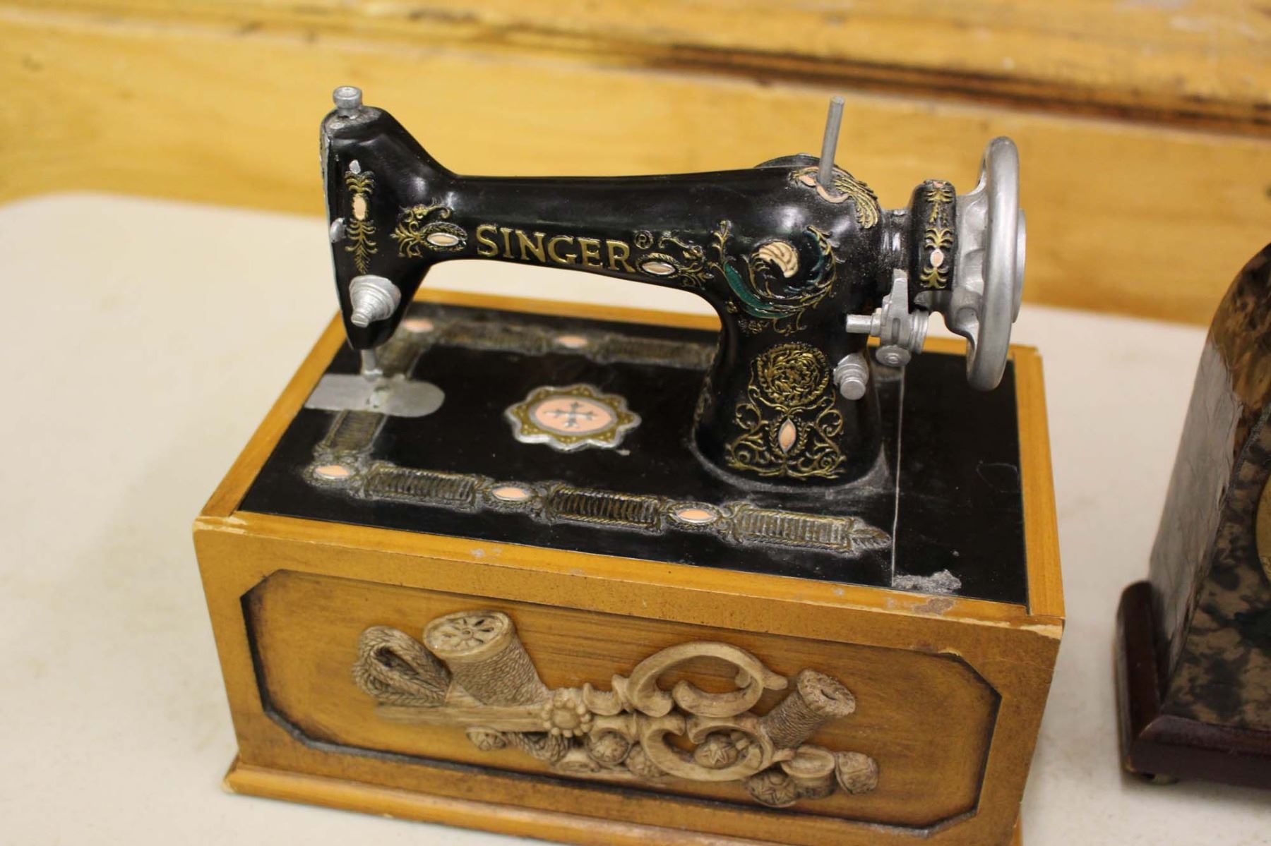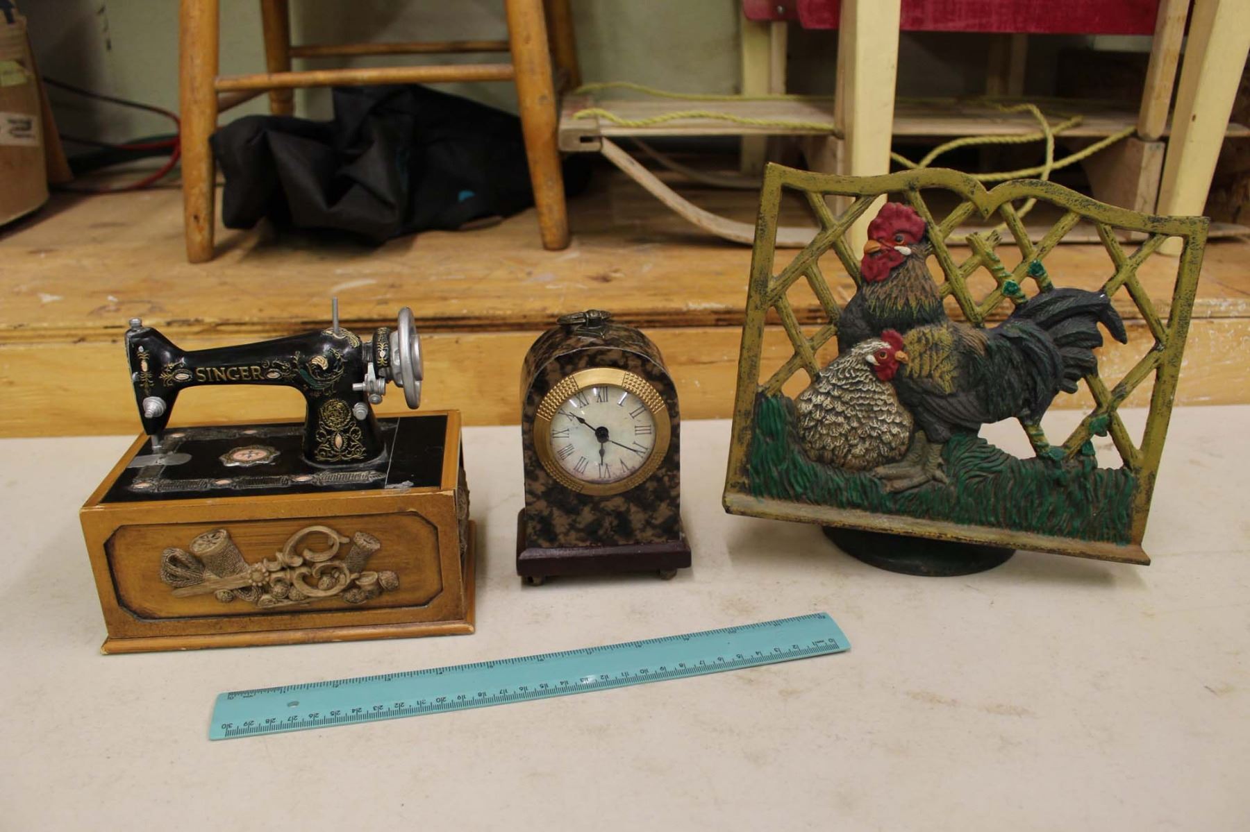 Miniature Singer Sewing Machine Supply Container, Clock& A Cast Iron Rooster Decoration