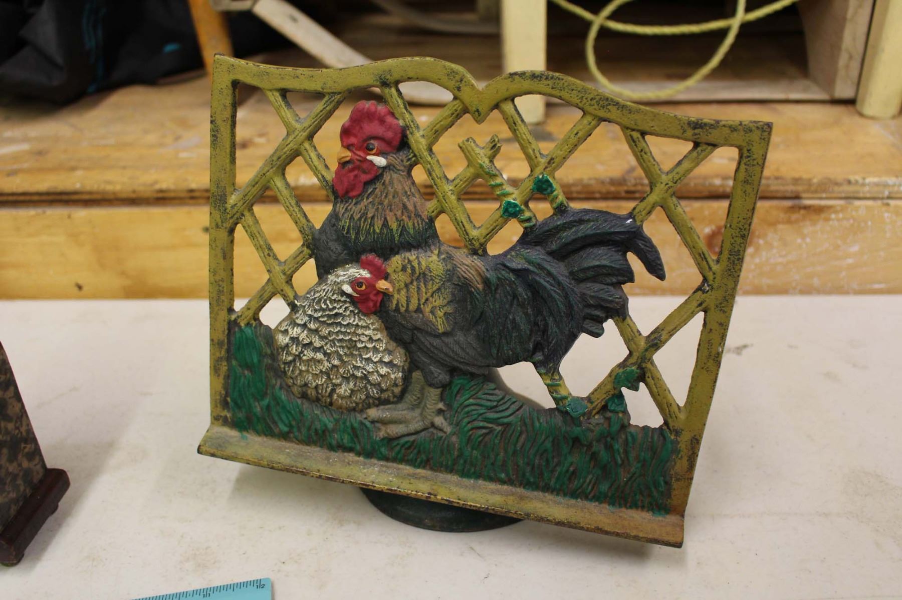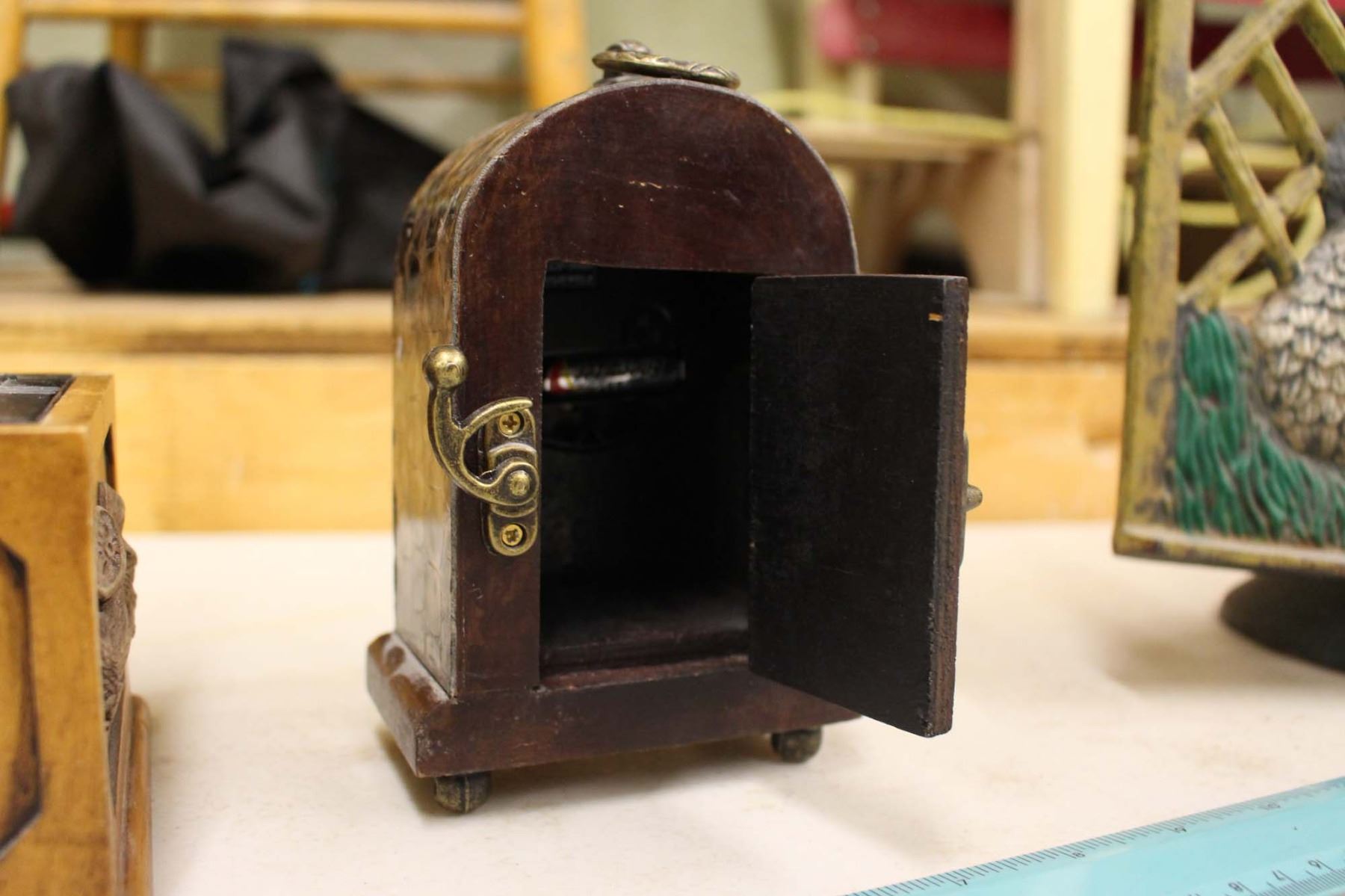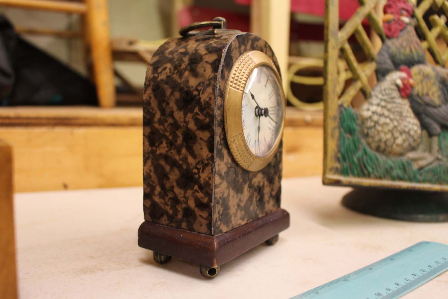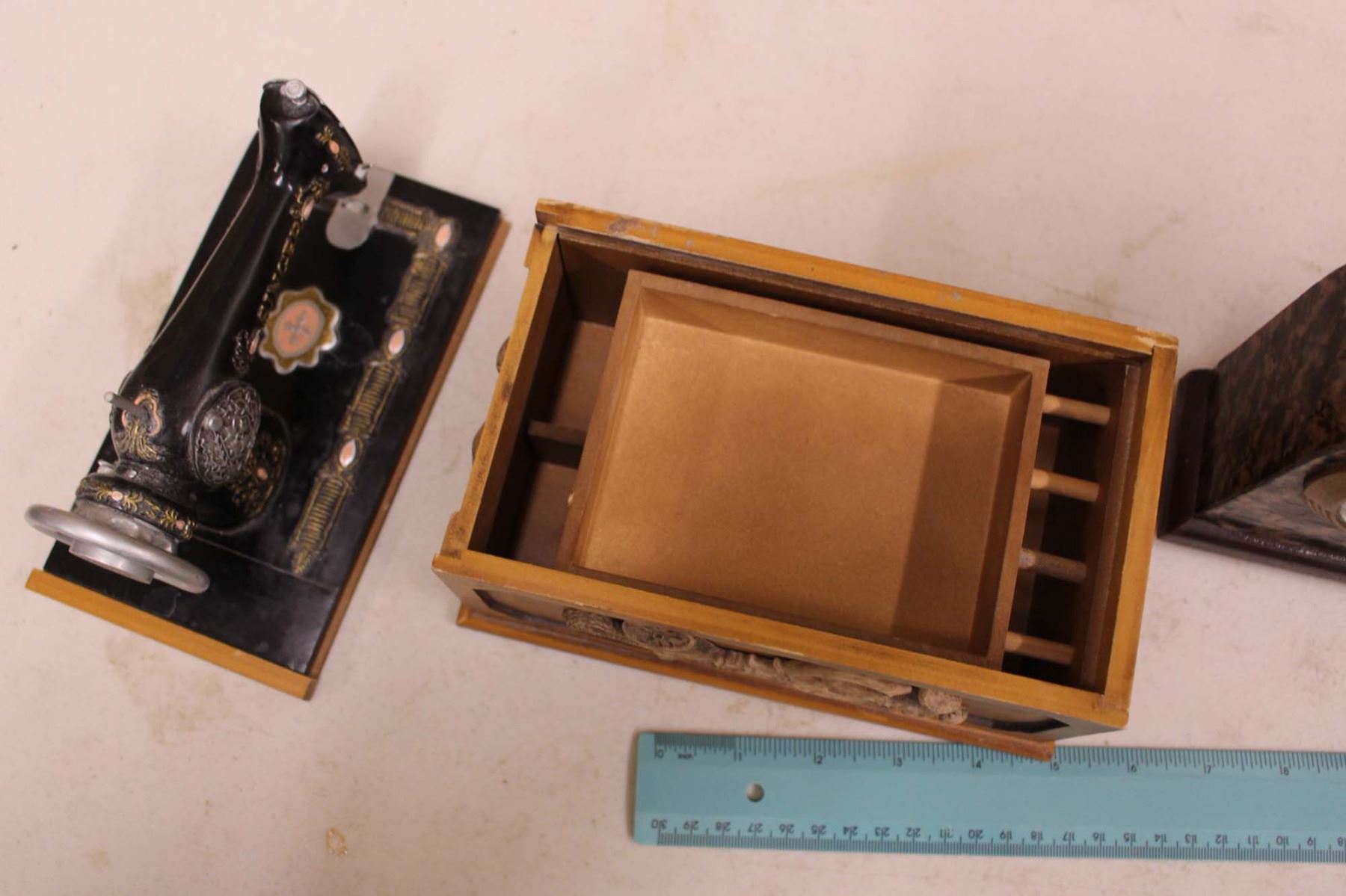 Miniature Singer Sewing Machine Supply Container, Clock& A Cast Iron Rooster Decoration