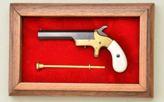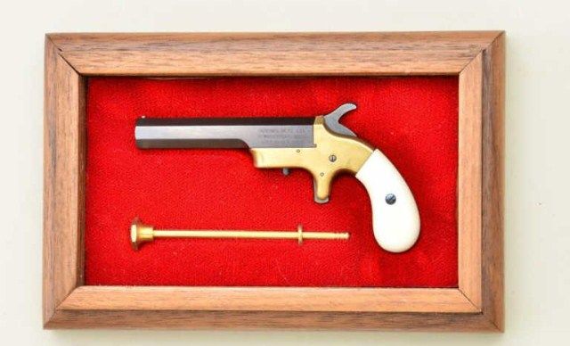 Miniature Southerner style single shot deringer in display case with cleaning rod, unmarked possibly WH Smith. The mini measures approx 3-1/4” overall, is in excellent condition. Est.; $400-$800.