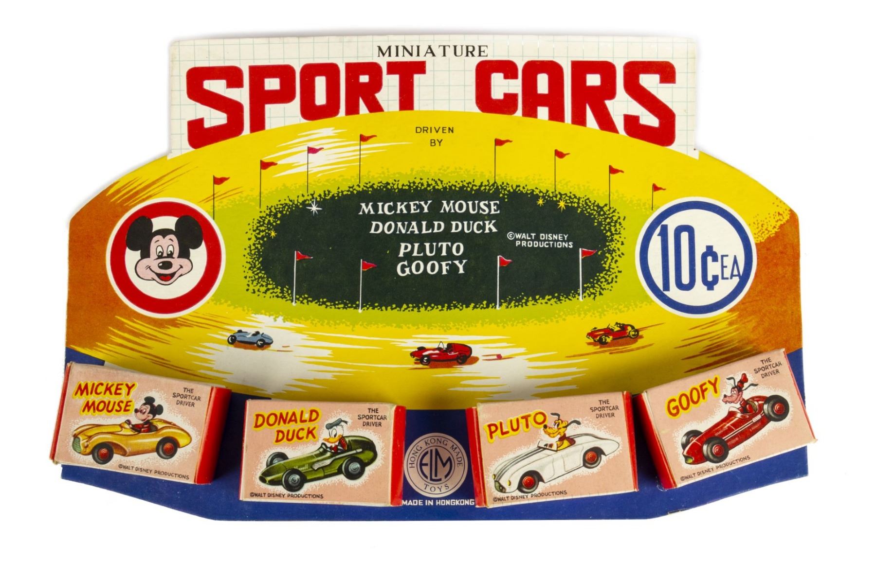 (Marx, 1950s) A very rare store display for miniature sports cars driven by classic Walt Disney characters. Created by Marx Toys under their Empire Louis Marx (ELM) brand from their Hong Kong based subsidiary, this display contains (4) toy cars for Mickey, Donald, Pluto, and Goofy, which are adhered to a board backing with a built-in stand. Measuring 8"x12.25", the store display is in very fine condition.