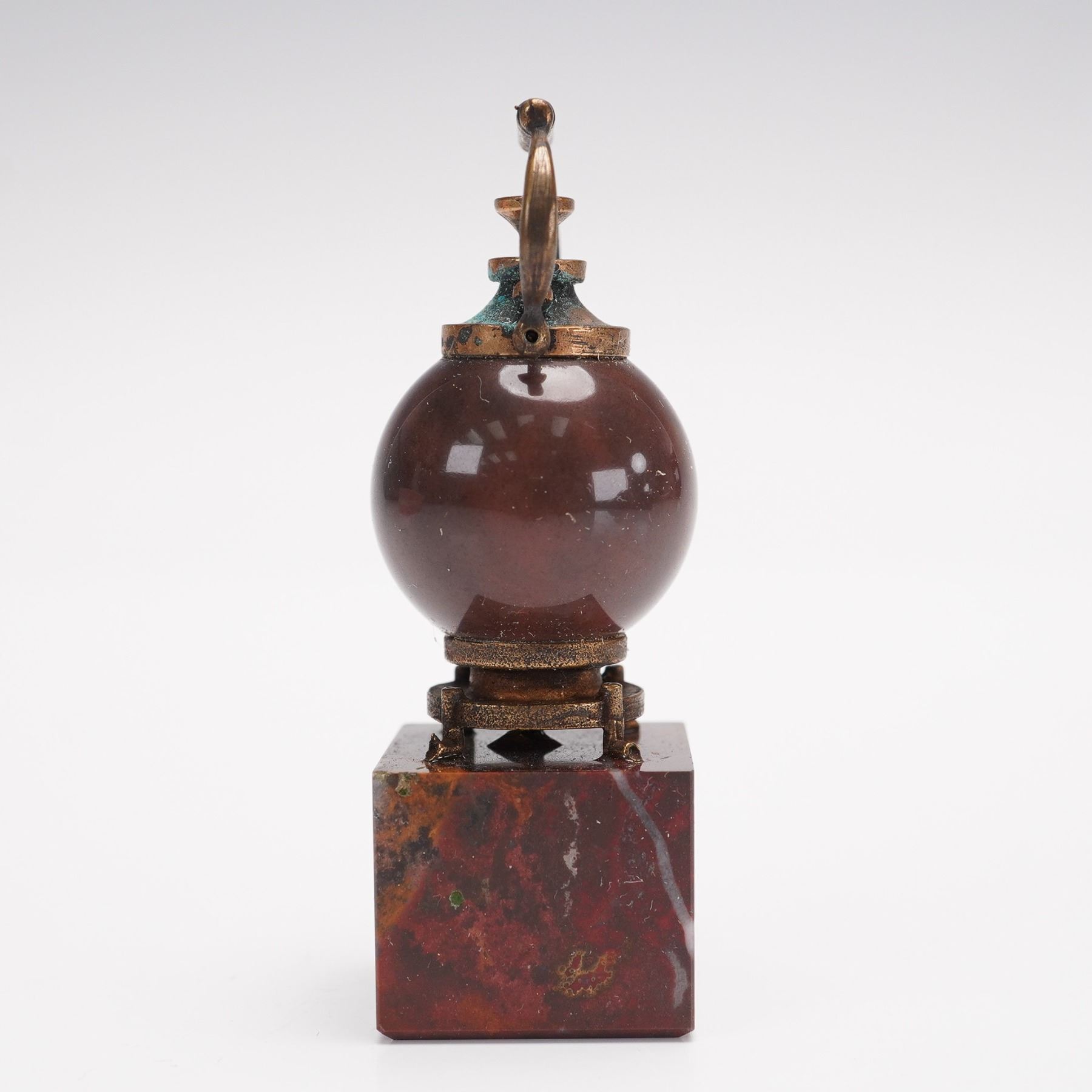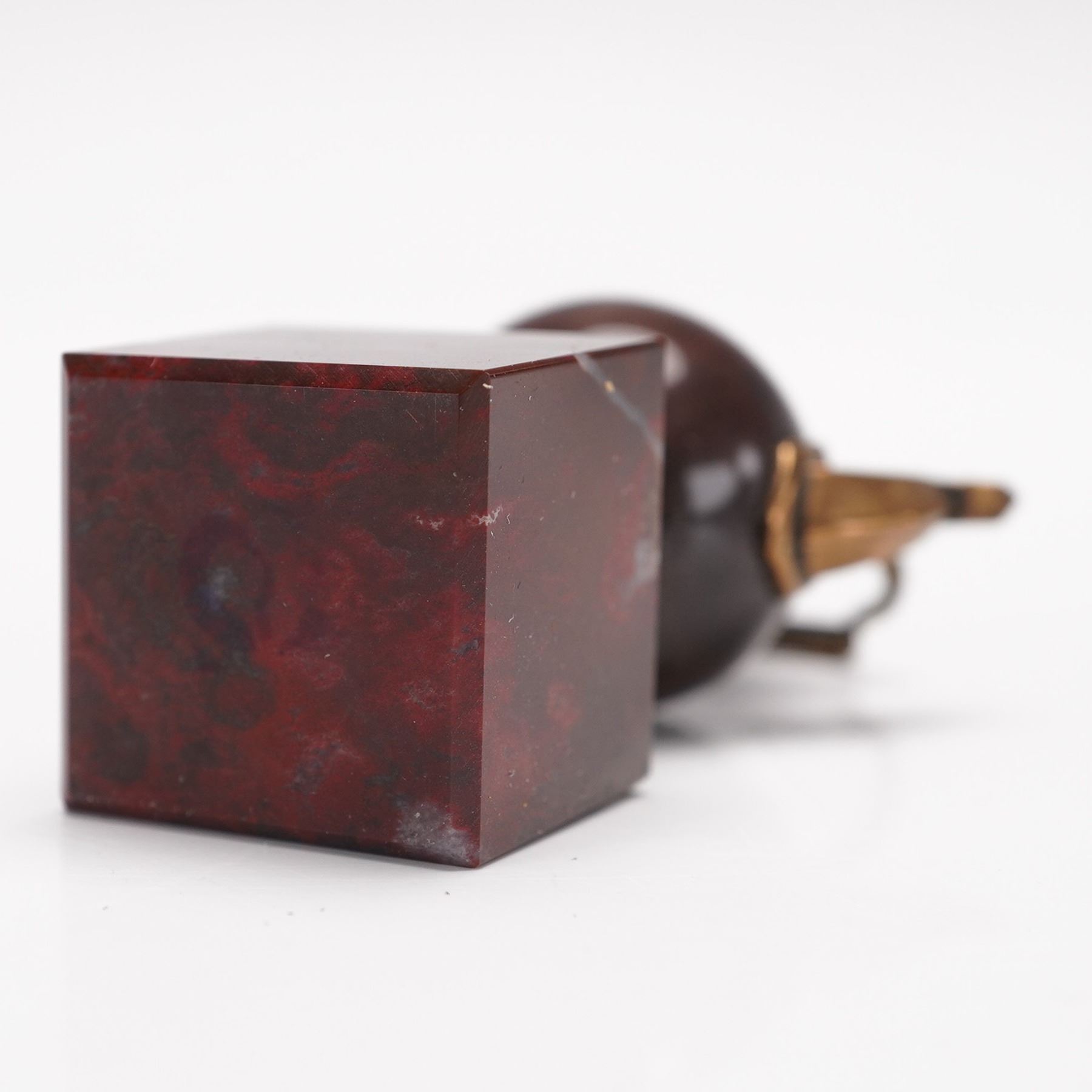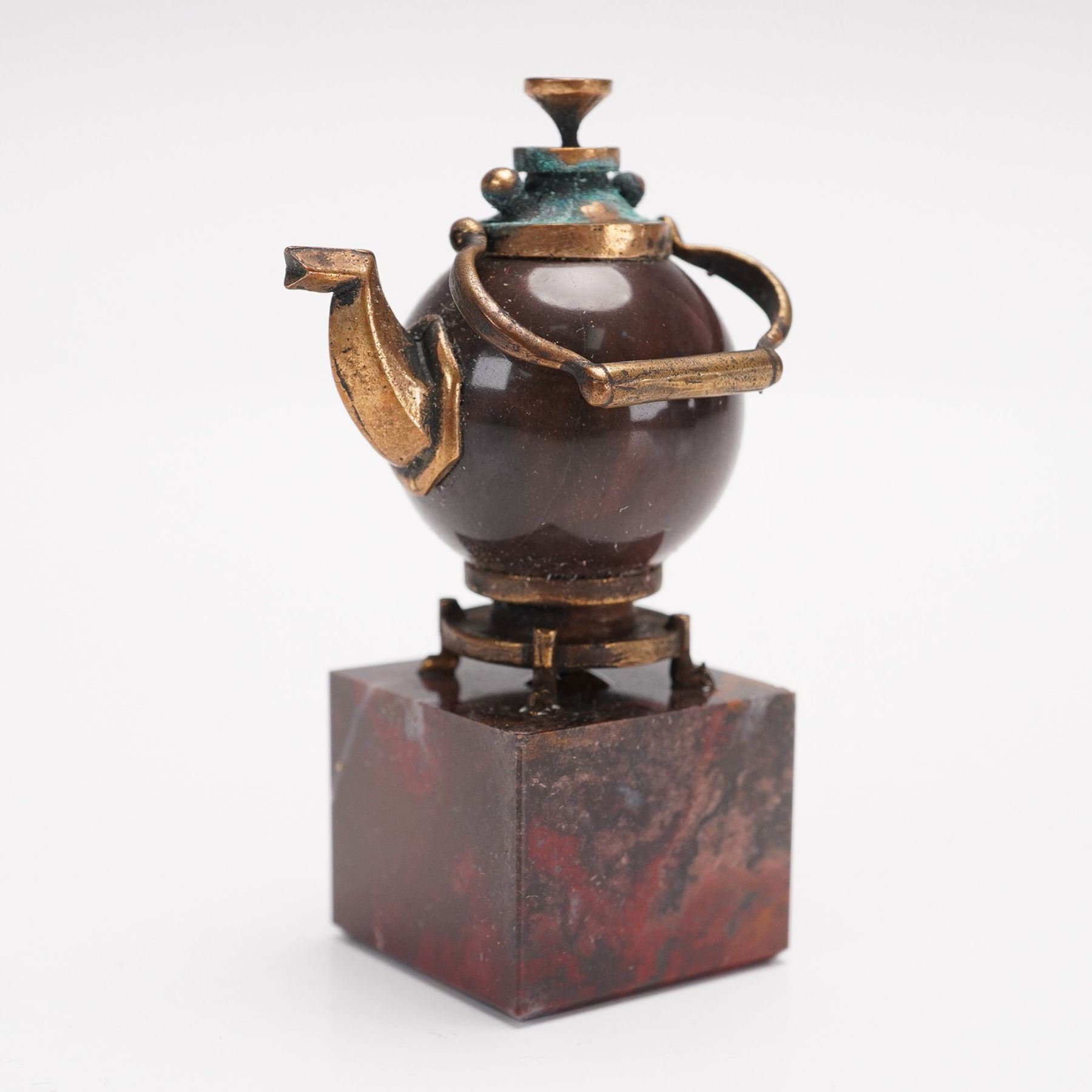This miniature teapot sculpture features a richly polished, deep reddish-brown stone body mounted on a matching stone cube pedestal. The elegantly curved handle, stout spout, and domed lid are crafted from what appears to be patinated brass or bronze, adding a golden warmth that contrasts with the stone's earthy tones. The fine detailing and material contrast evoke a fusion of antique charm and modern artistry. This handcrafted piece is both a decorative collectible and a conversation starter. Approximately 2.5"H. Includes a fitted box measuring 3.5"L x 2.5"W.
