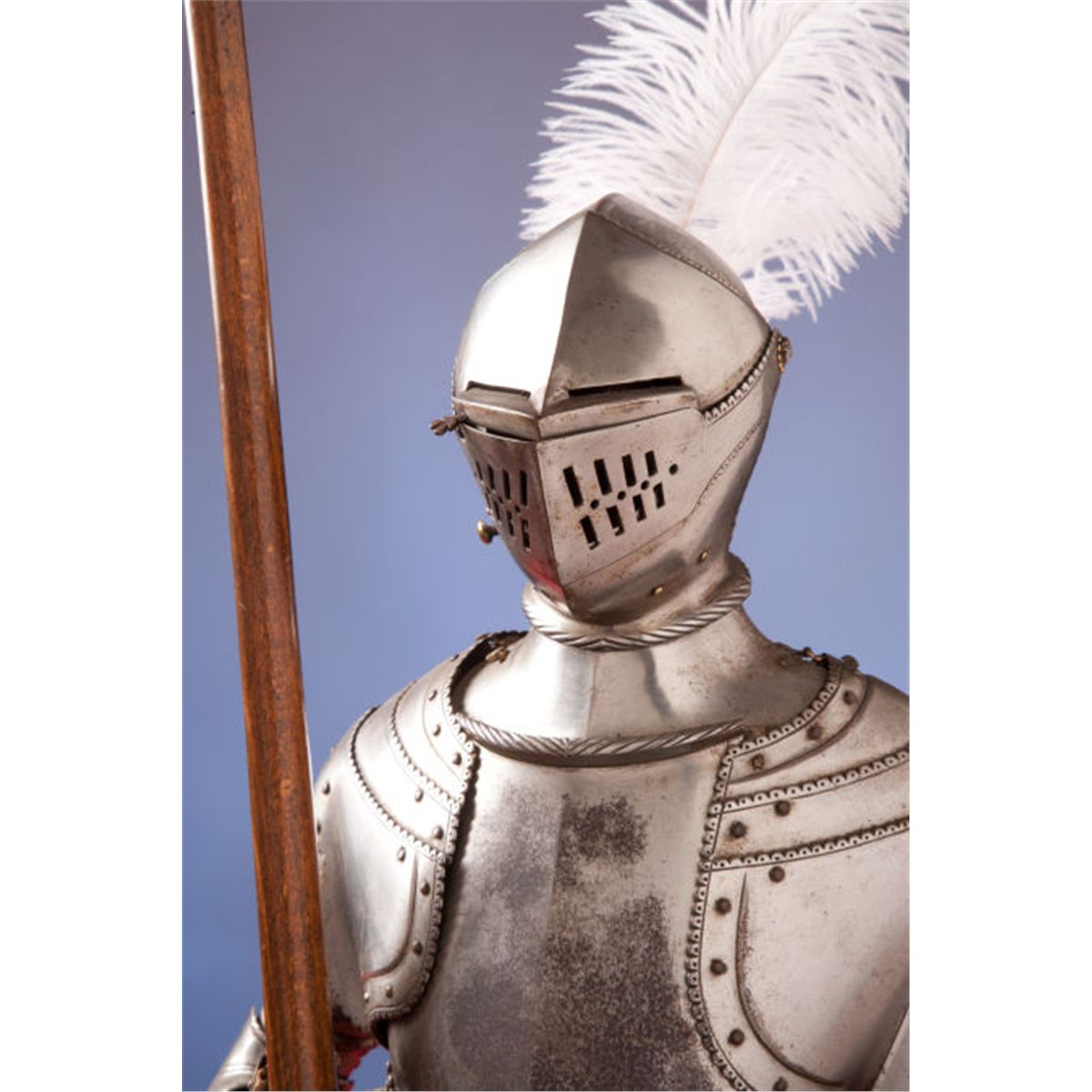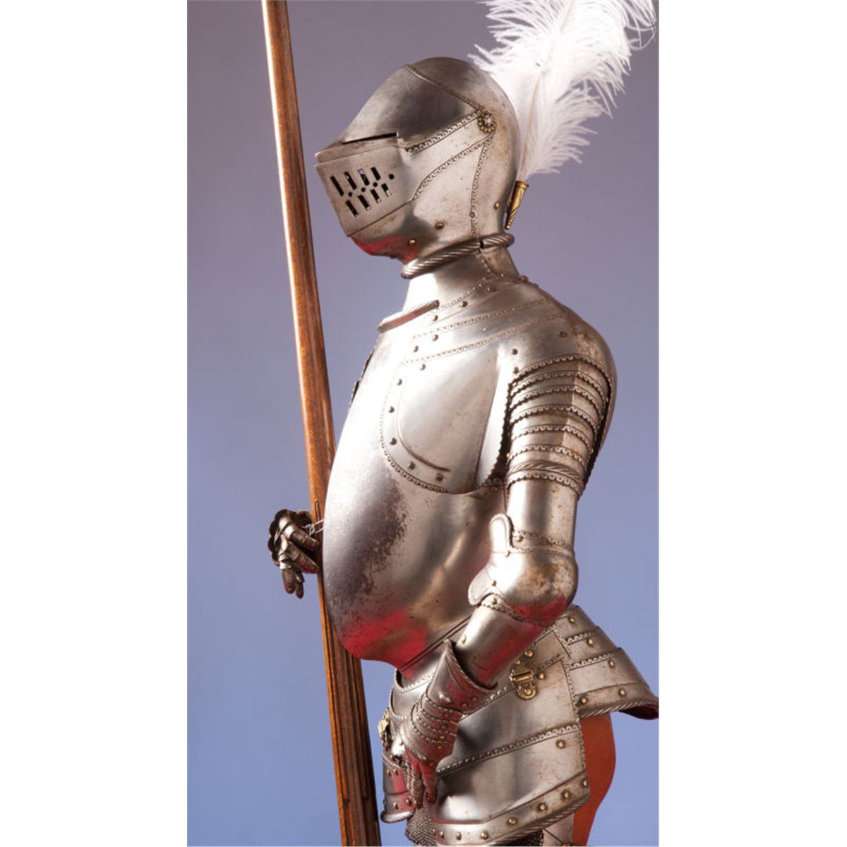 Miniature Suit of Armor in the 16th Century German Style. A finely made miniature suit of armor with layered and articulated elements, brass studs and scalloped borders with roped edges. Pigeon-breasted chestplate. Multi-element close helmet with movable visor. Wooden lance and feathered helm. Chain mail skirt. Mounted on a ribbed, round wooden plinth. Height: 32 ½-inches. Condition: Fair. Metal with age wear and patina. Some damage and repairs to figural form. Needs some restoration.