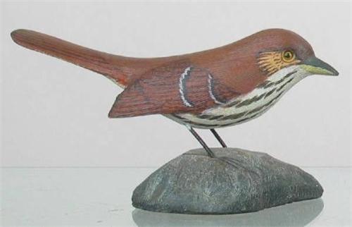 Miniature Thrasher with drop wing carving by Jess Blackstone. "Thrasher", #31 and typical JB signature along with collection #37 in a circle in pencil on the bottom of the mount. XOC. (decoy)