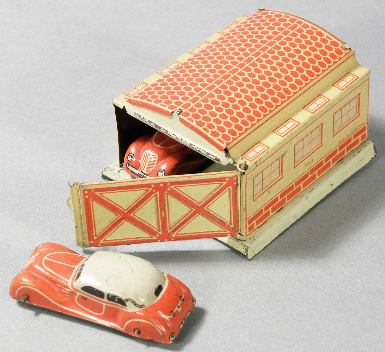 Miniature Tin Toy Garage w/two cars. Near mint condition. Garage measures 2 X 1 1/2 X 2 1/2 inches. Starting bid $30