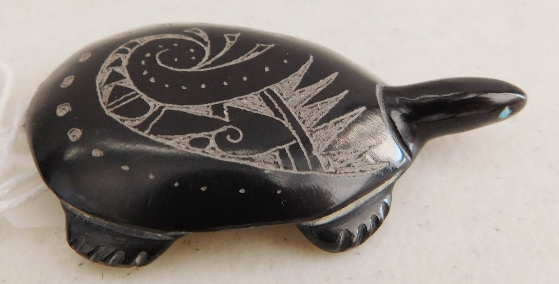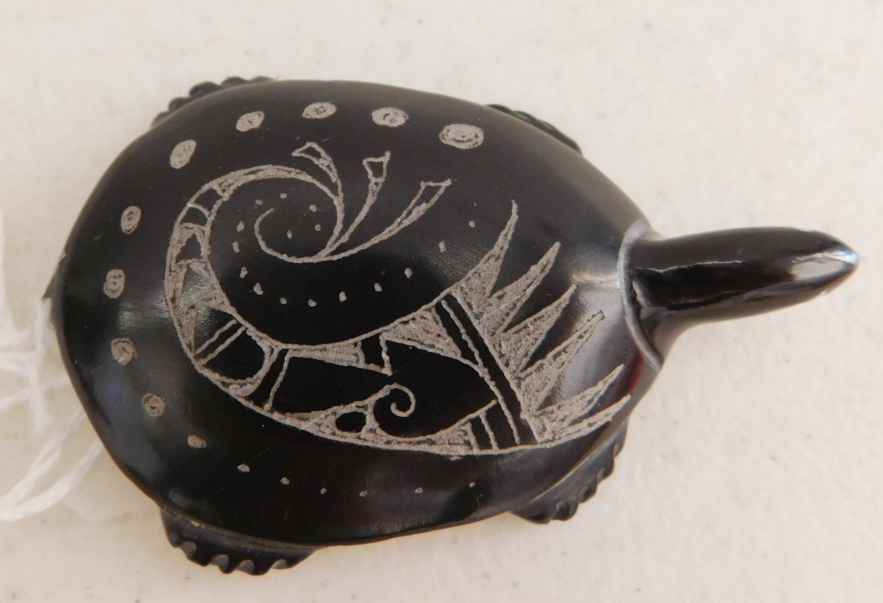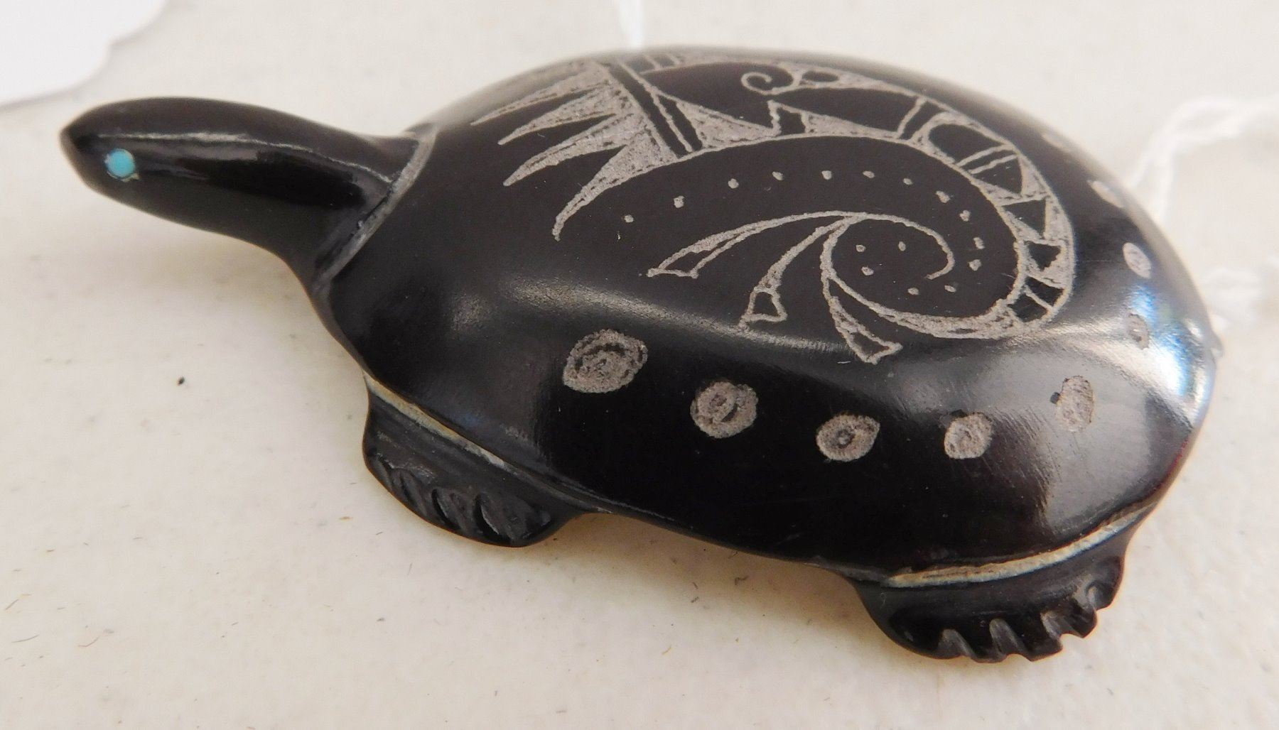 Miniature Turtle Fetish, 20th century item. Made of stone, the item measures 2 1/2" x 1 7/8". Signed BE. Fine carving on turtle, could possibly have inlaid turquoise for eyes. Condition: Good, see images. Shipping: $9.50 w/insurance and signature.