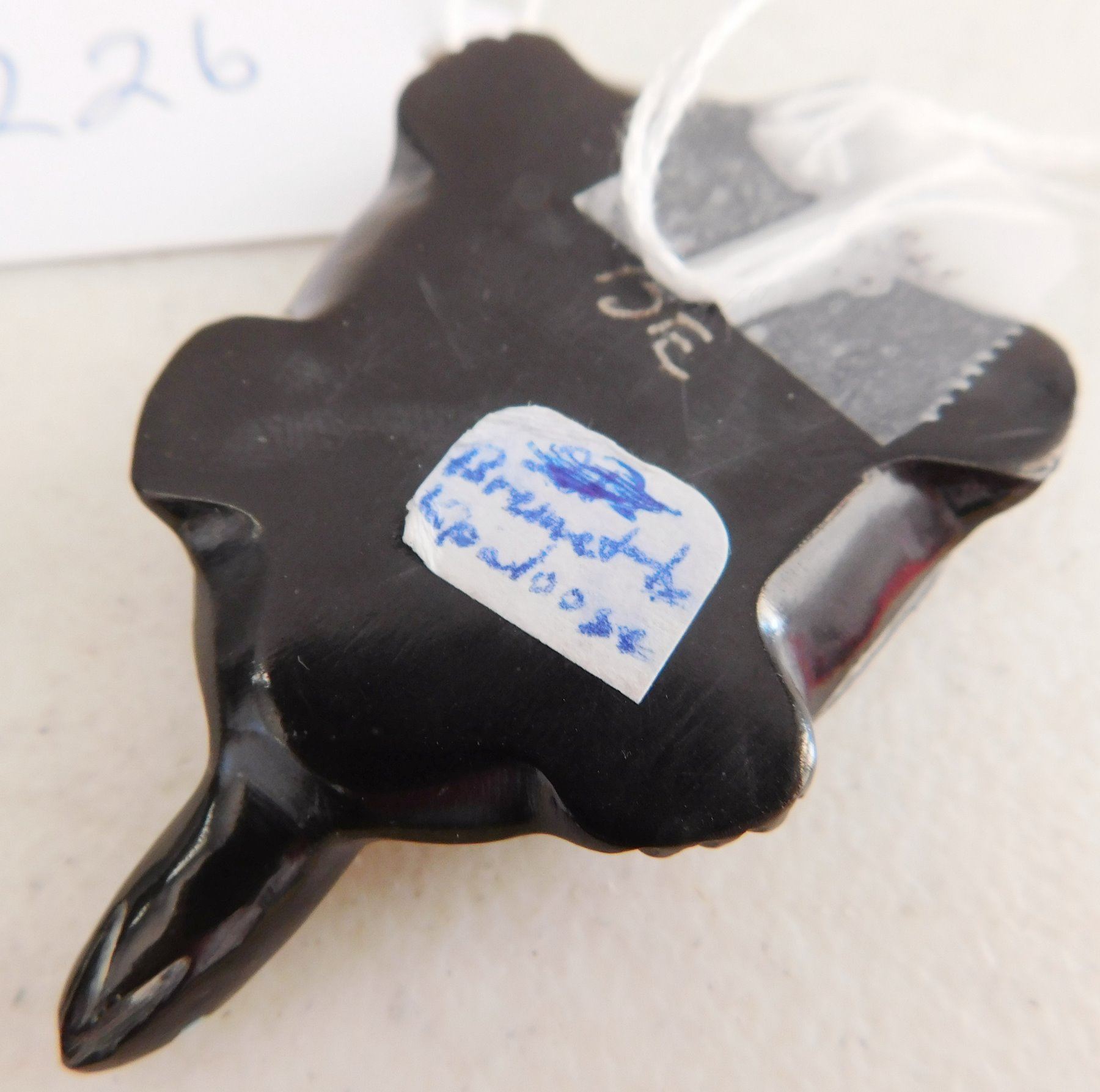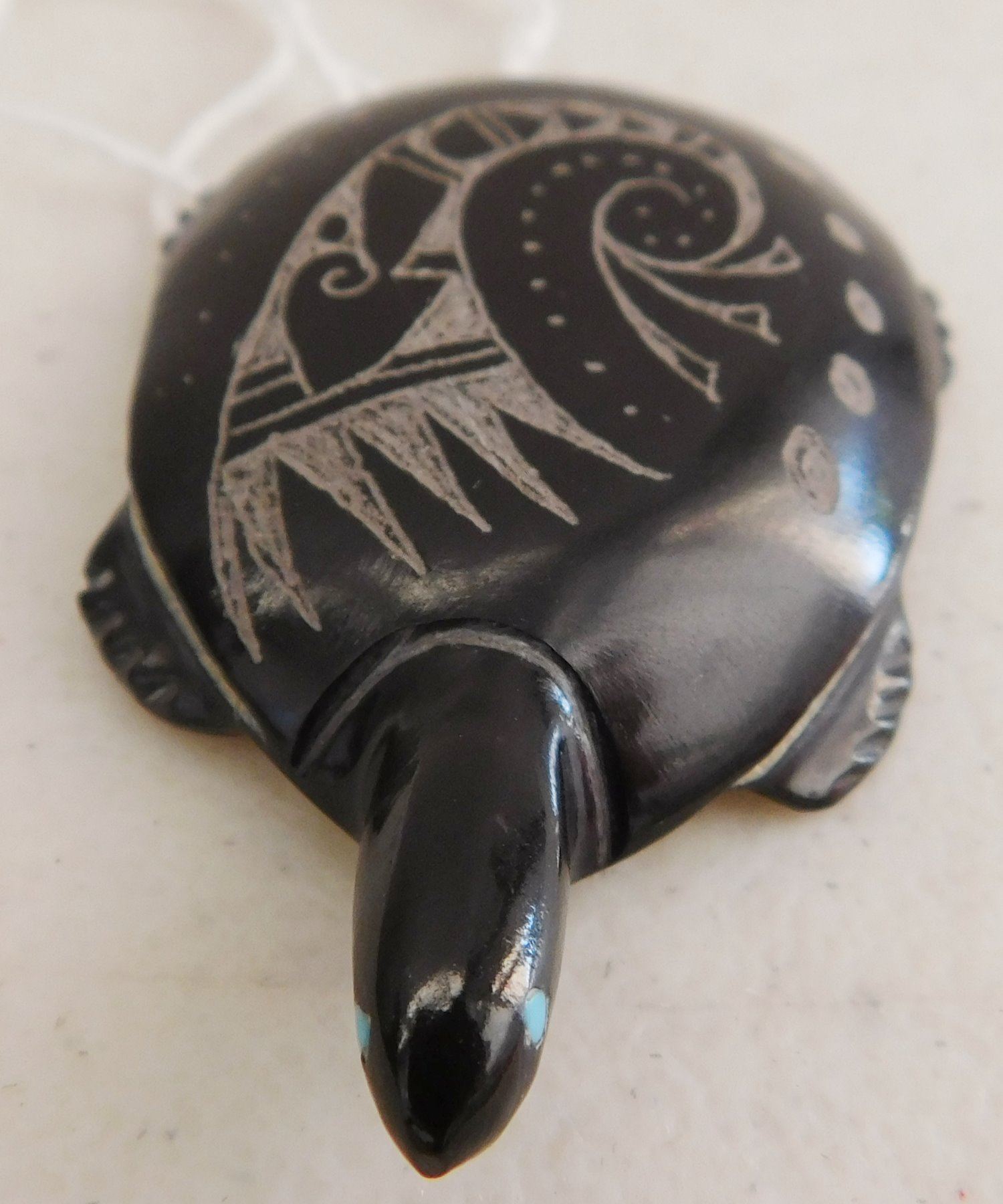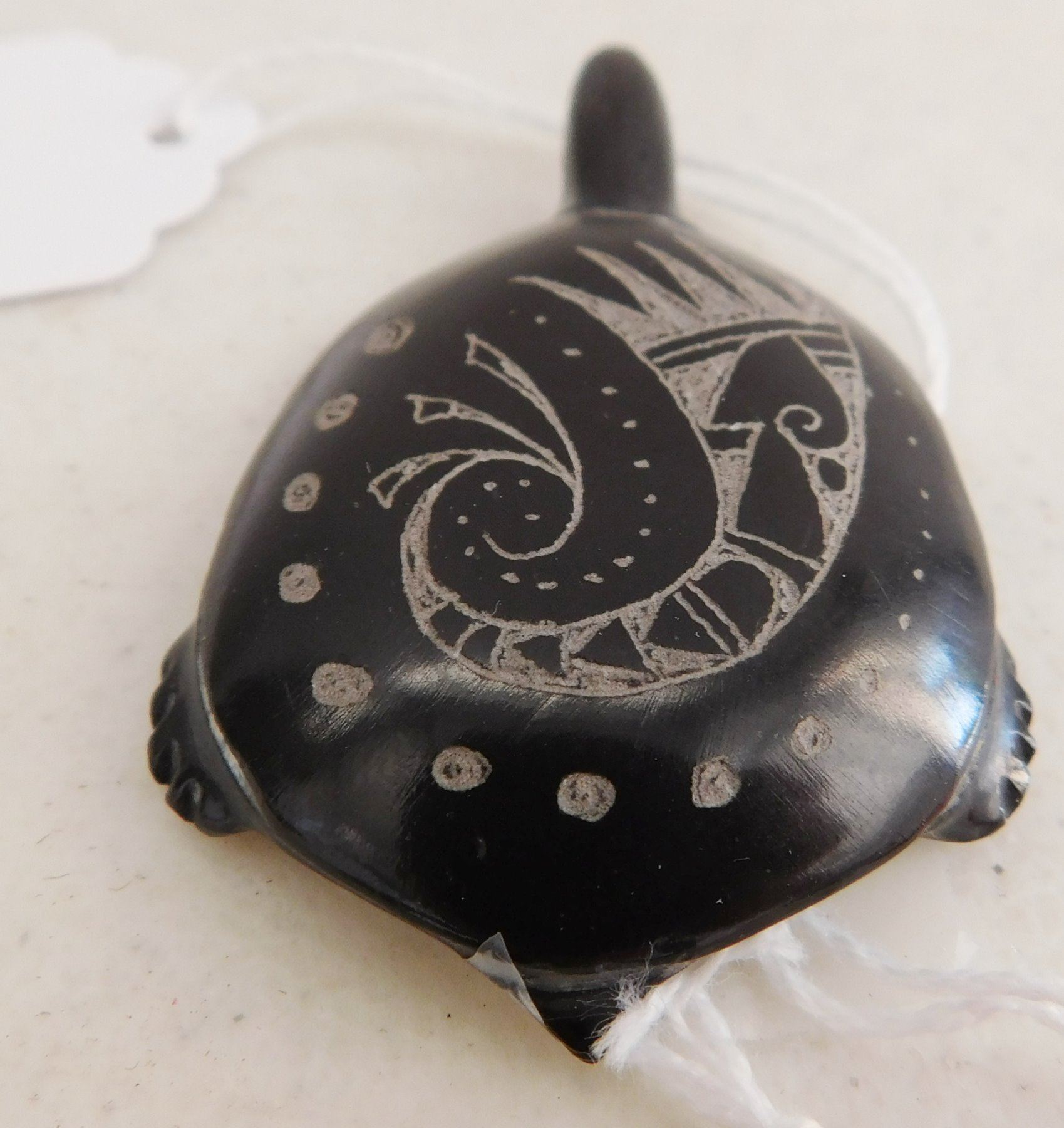 Miniature Turtle Fetish, 20th century item. Made of stone, the item measures 2 1/2" x 1 7/8". Signed BE. Fine carving on turtle, could possibly have inlaid turquoise for eyes. Condition: Good, see images. Shipping: $9.50 w/insurance and signature.