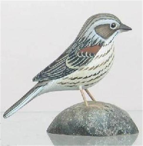 Miniature Vesper Sparrow with split wing carving by Jess Blackstone. Vesper Sparrow", #14 and typical JB signature along with collection #57 in a circle in pencil on the bottom of the mount. XOC. (decoy)