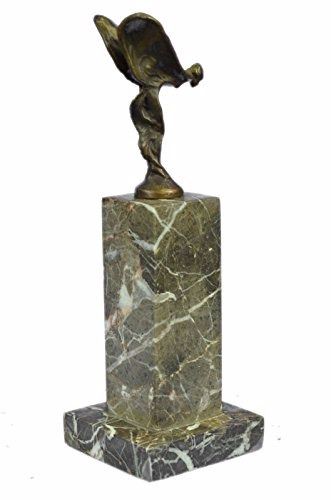The bronze slender woman bends in a high bow. Both arms stretch backwards bird-like as the definition of her limbs dissolve into wings of fabric. Her head is posed straight at the beholder as her eyes seem to be mustering the levity for flight. Great details are possible in the fabric because of the method of lost-wax casting used. She stands perched upon a black marble base and stained with brown patina tarnish. Bronze Dimensions with Marble Base: Height 11 X Width 4 inches. Weight: 4 LBS